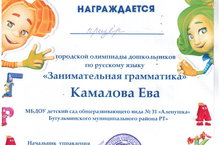 Наша воспитанница Камалова Ева стала призером городской олимпиады среди дошкольников по русскому языку "Занимательная грамматика". Поздравляем с достойным результатом!