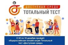 В период с 2 по 10 декабря 2022 года пройдет Общероссийская акция Тотальный тест «Доступная среда», приуроченная к Международному дню инвалидов. Формат проведения мероприятия – онлайн. Участники проходят Тотальный тест «Доступная среда» с любого персонального устройства с доступом в Интернет.