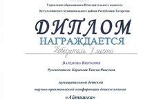 Әзерлек төркеме тәрбияләнүчебез Варенова Викторияне мәктәпкәчә яшьтәге балалар арасында "Айтишка" муниципаль балалар фәнни-гамәли конференциясендә җиңүе белән котлыйбыз!