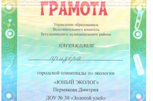 Поздравляем нашего призёра муниципальной олимпиады по экологии «Юный эколог» Дмитрия Пермякова воспитанника подготовительной группы №7 с победой!