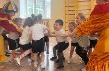 Во второй младшей группе "Ягодка" прошло спортивное развлечение с родителями. Как положено на празднике, дети и родители от души веселились: водили хоровод, играли, перетягивали канат, пели русскую народную песню "Блины", частушки, скоморохи исполняли потешки.
