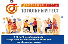 В период с 2 по 10 декабря 2022 года проводится акция Тотальный тест "Доступная среда", приуроченная к Международному дню инвалидов. Формат проведения мероприятия-онлайн. Участники проходят Тотальный тест "Доступная среда"дистанционно с любого персонального устройства с доступом в интернет. Регистрация на сайте мероприятия по ссылке www.total-test.ru