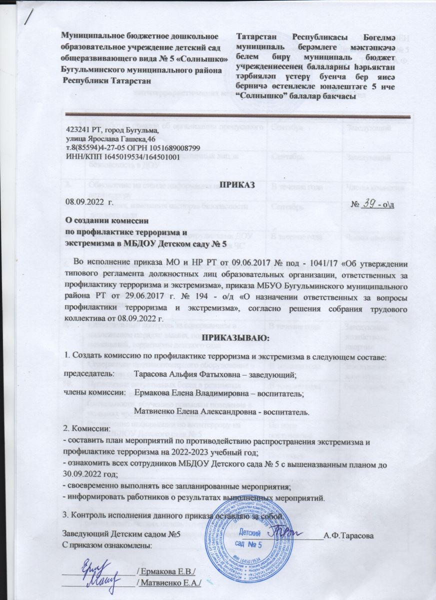Приказ "О создании комиссии по профилактике терроризма и экстремизма в МБДОУ Детском саду № 5"