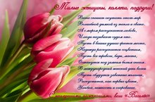 Милые женщины! От всей души поздравляем вас с праздником, с Международным женским днём! Пусть Весна вас радует, вдохновляет, наполняет энергией! Любви и счастья вам! Мира и тепла вашим семьям!