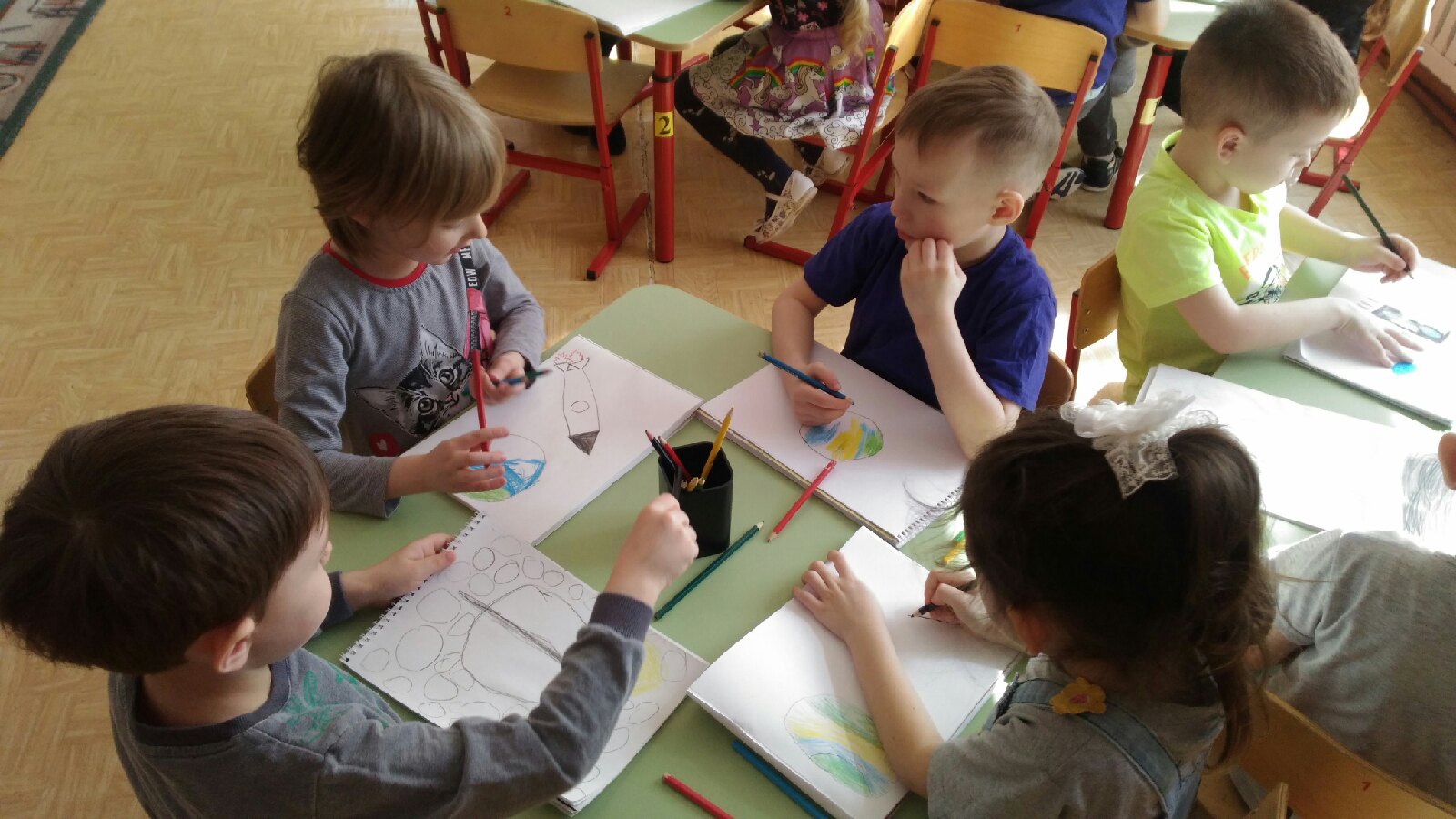 На занятии по рисованию "Загадочный мир Космоса" дети узнали о Вселенной и запечатлели её в своих рисунках.