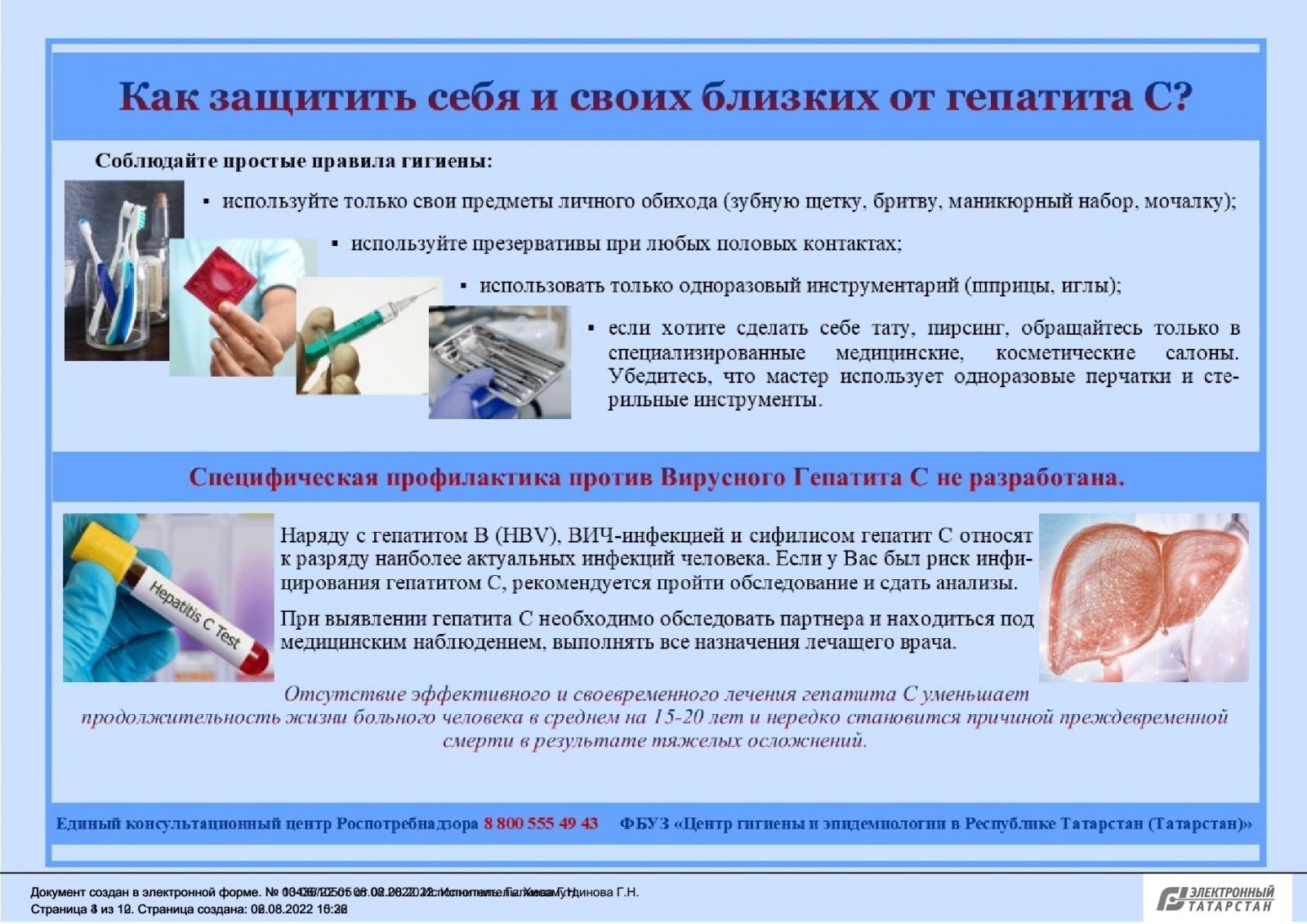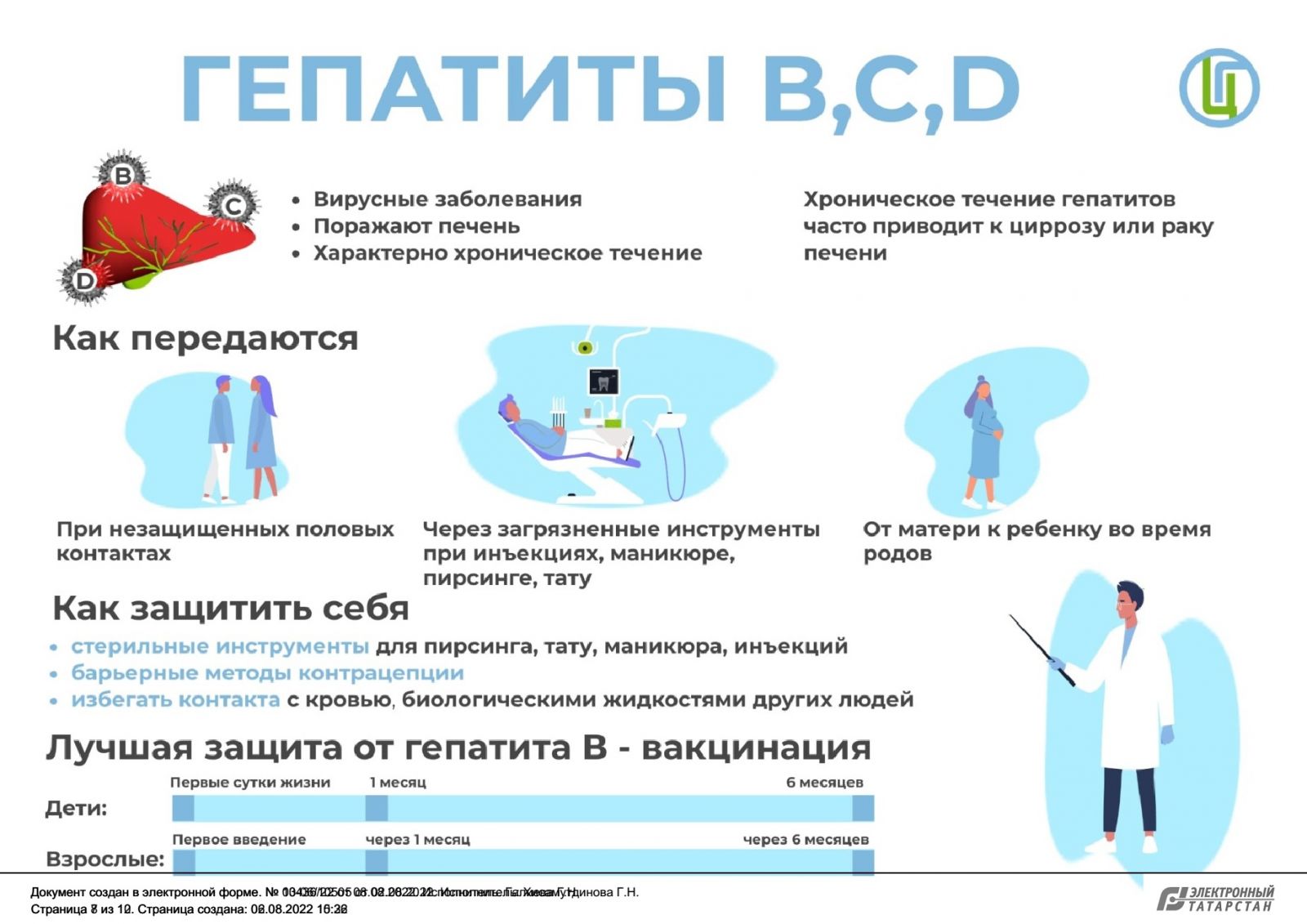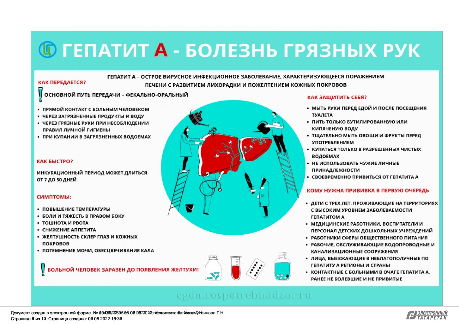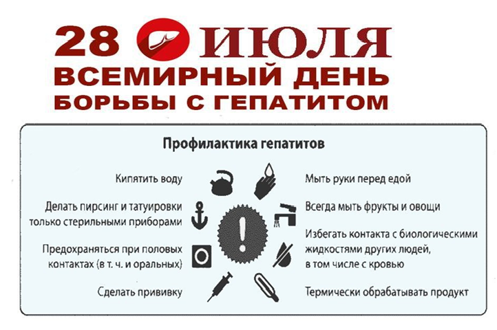 Опубликовано: 08.08.2022ФБУЗ «Центр гигиены и эпидемиологии в Республике Татарстан» Федеральной службы по надзору в сфере защиты прав потребителей и благополучия человека по Республике Татарстан в рамках реализации памятной даты «28 июля – Всемирный день борьбы с гепатитом» и в целях популяризации здорового образа жизни информирует население о профилактике гепатитов А, В, С, Д.