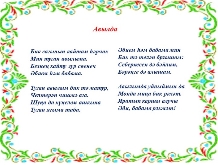 Воспитатель по обучению татарскому языку Музафарова Рамия Михайловна поработала над выбором произведения; осмысленностью произношения (выразительностью и чёткостью произношения, интонированием); артистизмом исполнения. Декорации, костюм участницы — всё было продумано и подобрано под выбранное стихотворение юной поэтессы (2007 г.р.) Нугмановой Камилы "Авылда" (В деревне).