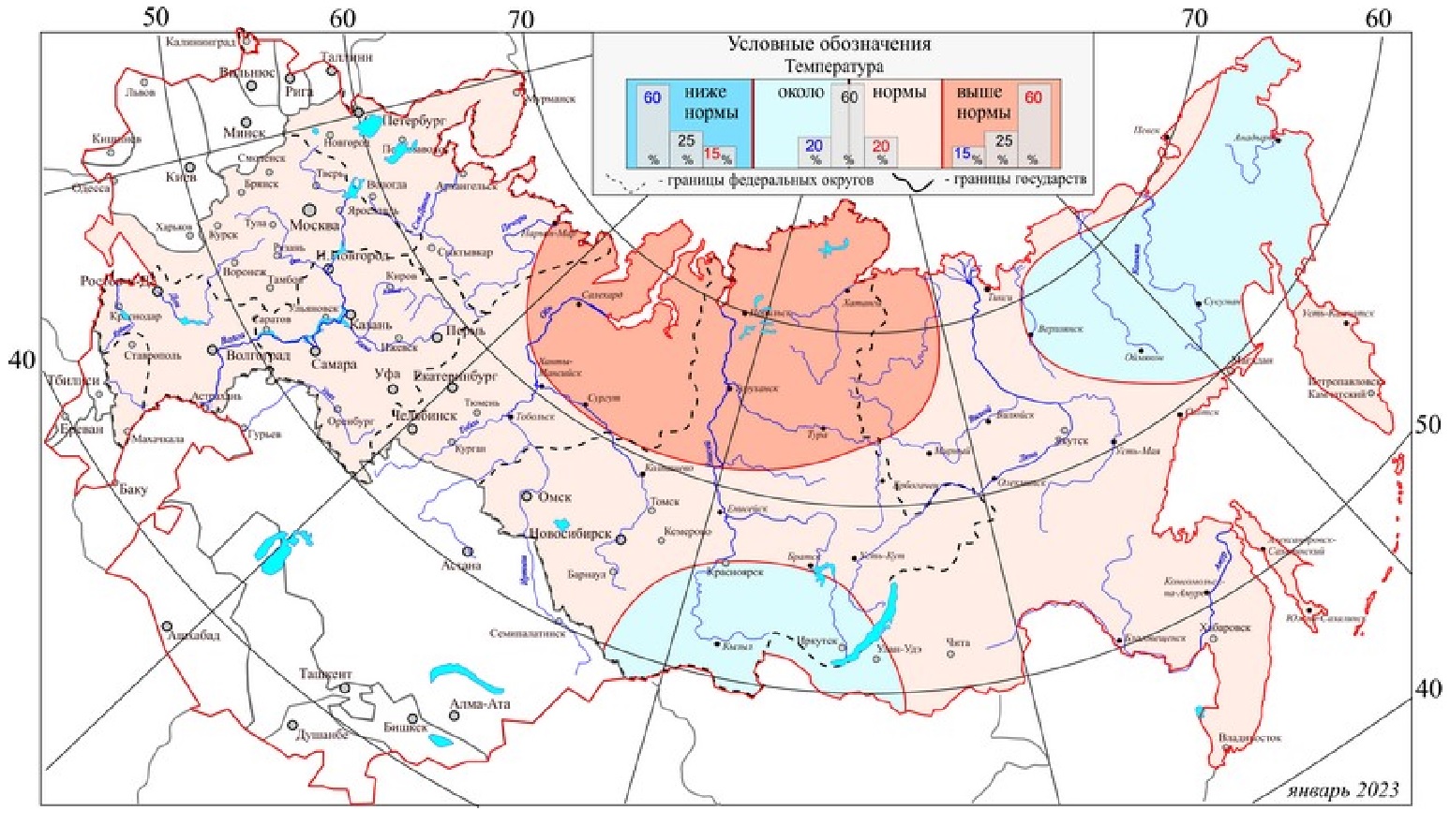 Ожидаемое распределение отклонений температуры воздуха и количества осадков от среднемноголетнего количества в январе 2023 г: