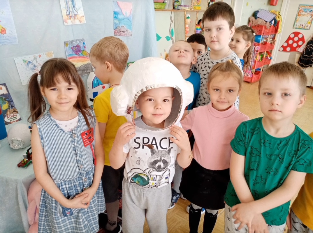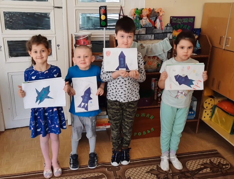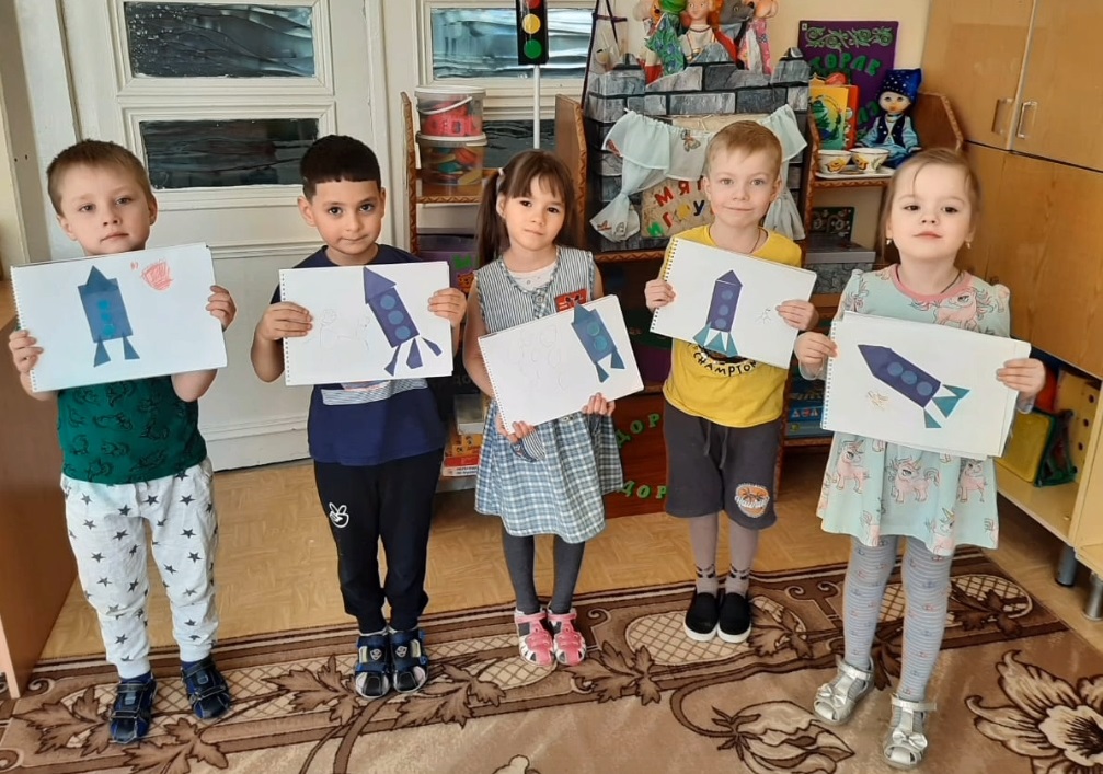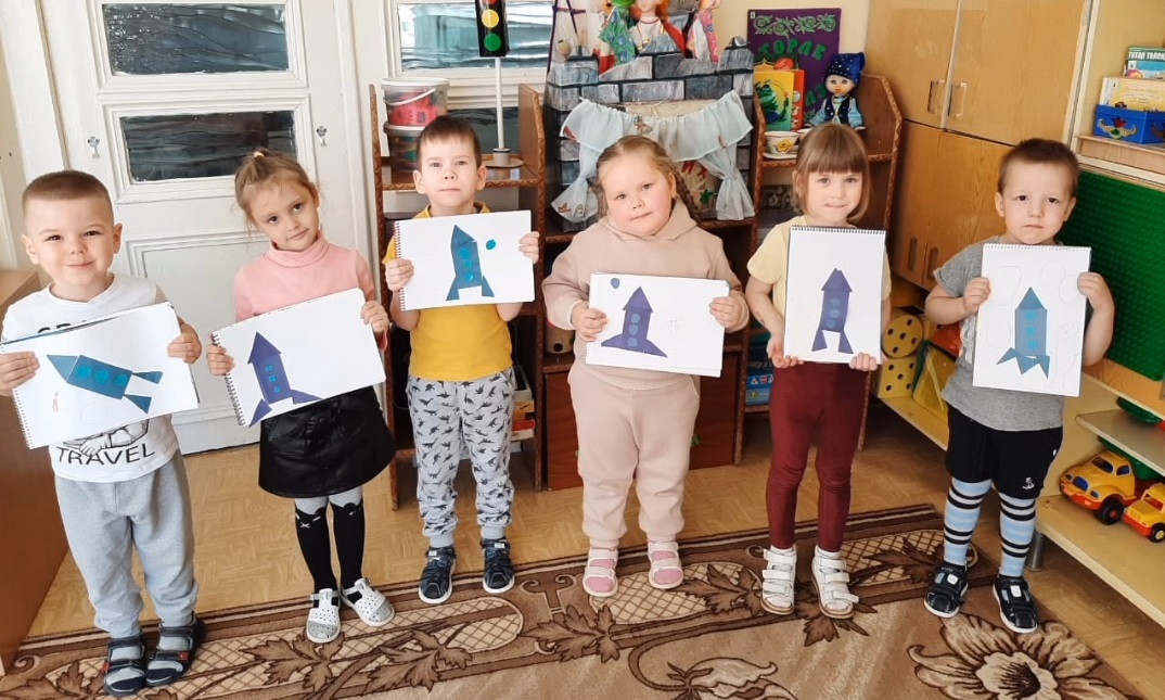 Для расширения кругозора в группе "Весёлые Ребята" были использованы иллюстрации о планетах, космонавтах, спутниках, созвездиях. В книжный уголок выставлены книги по теме недели. В беседах дети узнали о человеке, покорившем космическое пространство — Юрии Гагарине, первой женщине космонавте — Валентине Терешковой; о том как четвероногие друзья человека (Белка и Стрелка) проложили путь к звёздам; о планетах больших и маленьких, об их свойствах. Также посетили мини-музей подготовительной группы «Мир космоса». Узнав много интересного о вселенной, дети отразили это в художественно-продуктивной деятельности: выполнили аппликацию «Ракета».