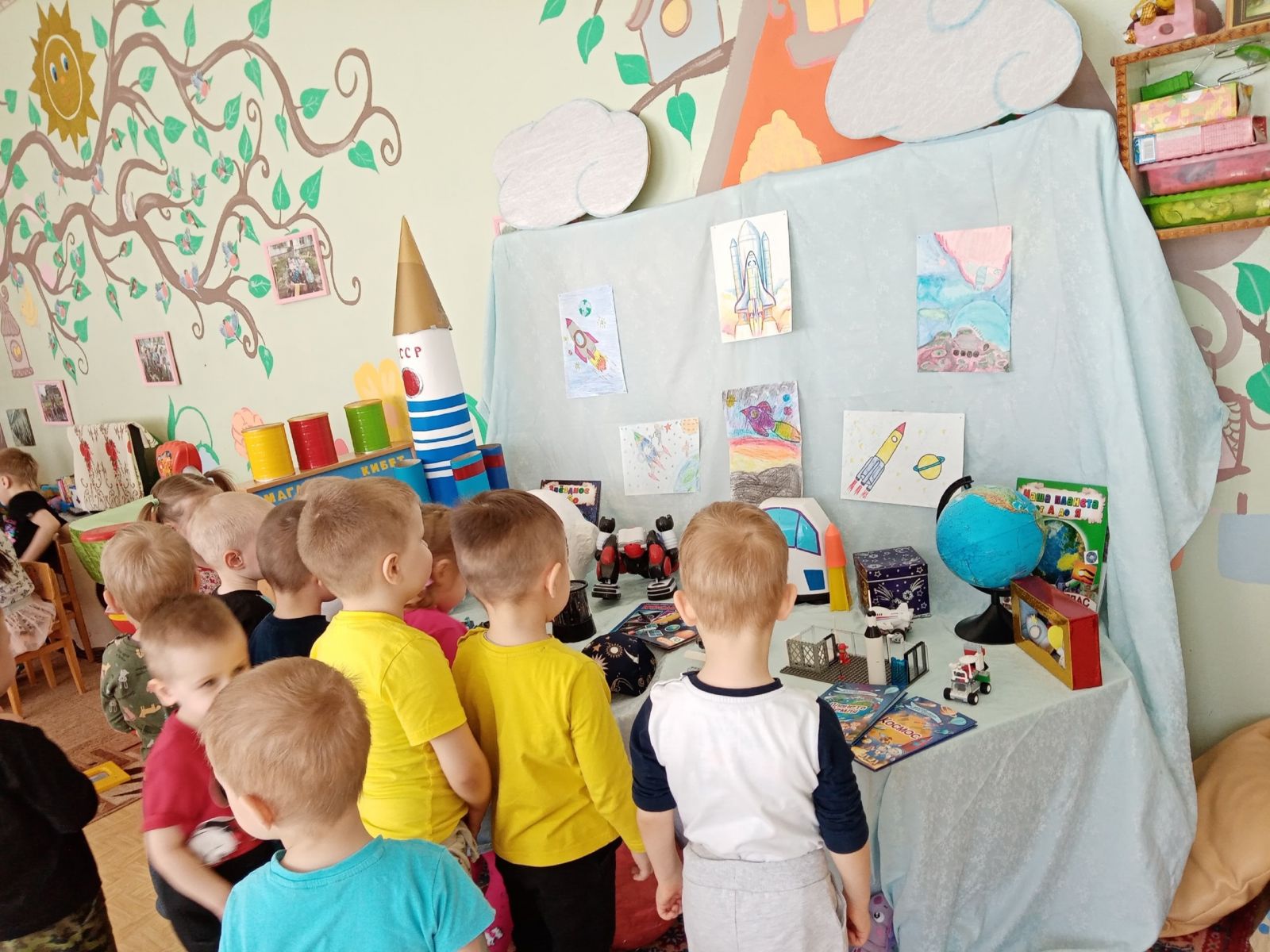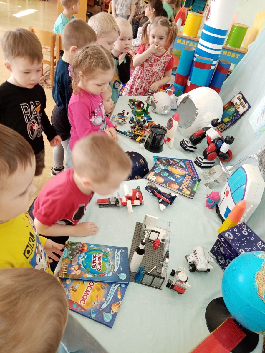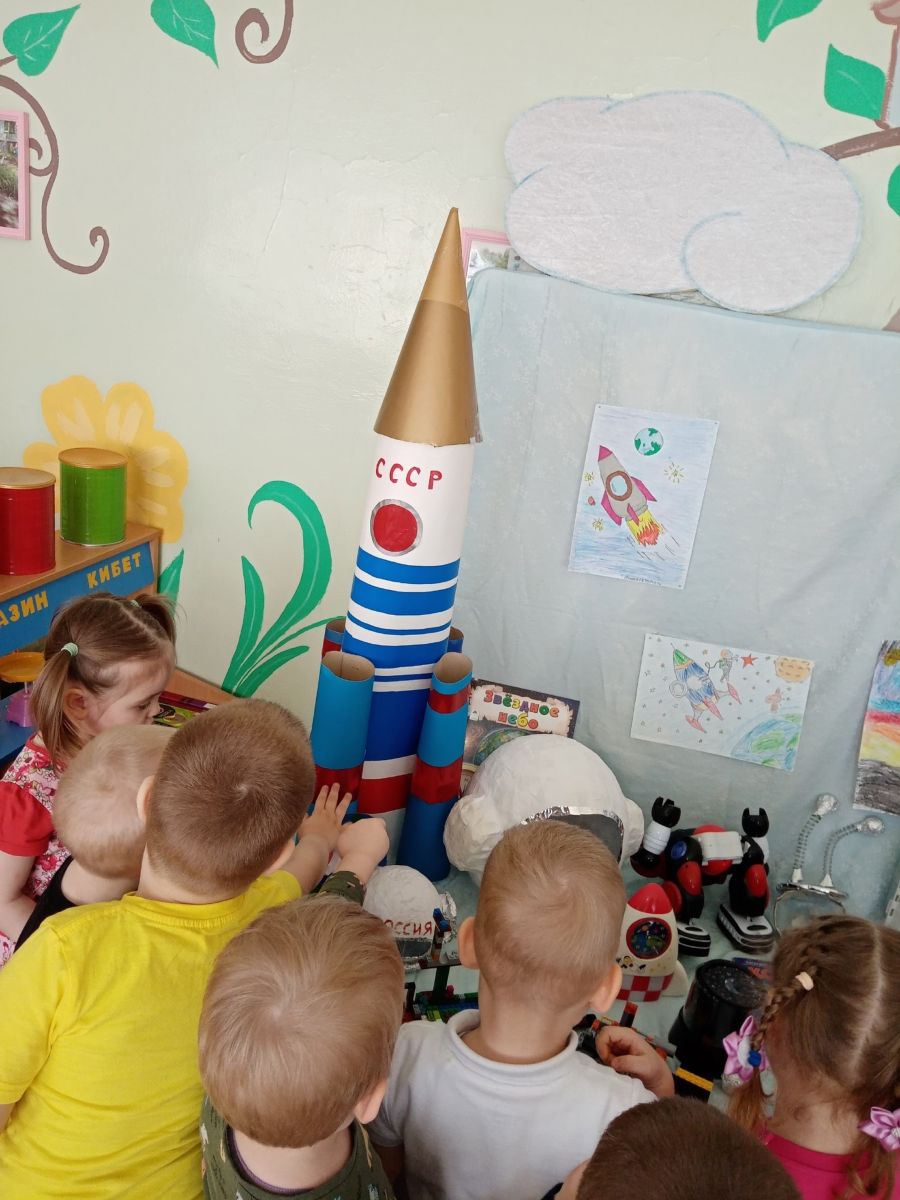 Сегодня малыши группы "Тамчыкай" посетили музей космоса, созданный силами родителей и детей нашего детского сада ко Дню космонавтики. воспитатели дали детям первичные представления о космических кораблях, звёздах, космосе; формировали представление ребят о планете Земля; расширили знания дошколят о профессии лётчика, космонавта. Педагоги познакомили ребят с первым космонавтом Ю. А. Гагариным. А на занятии по рисованию наши воспитанники с удовольствием рисовали ракету.
