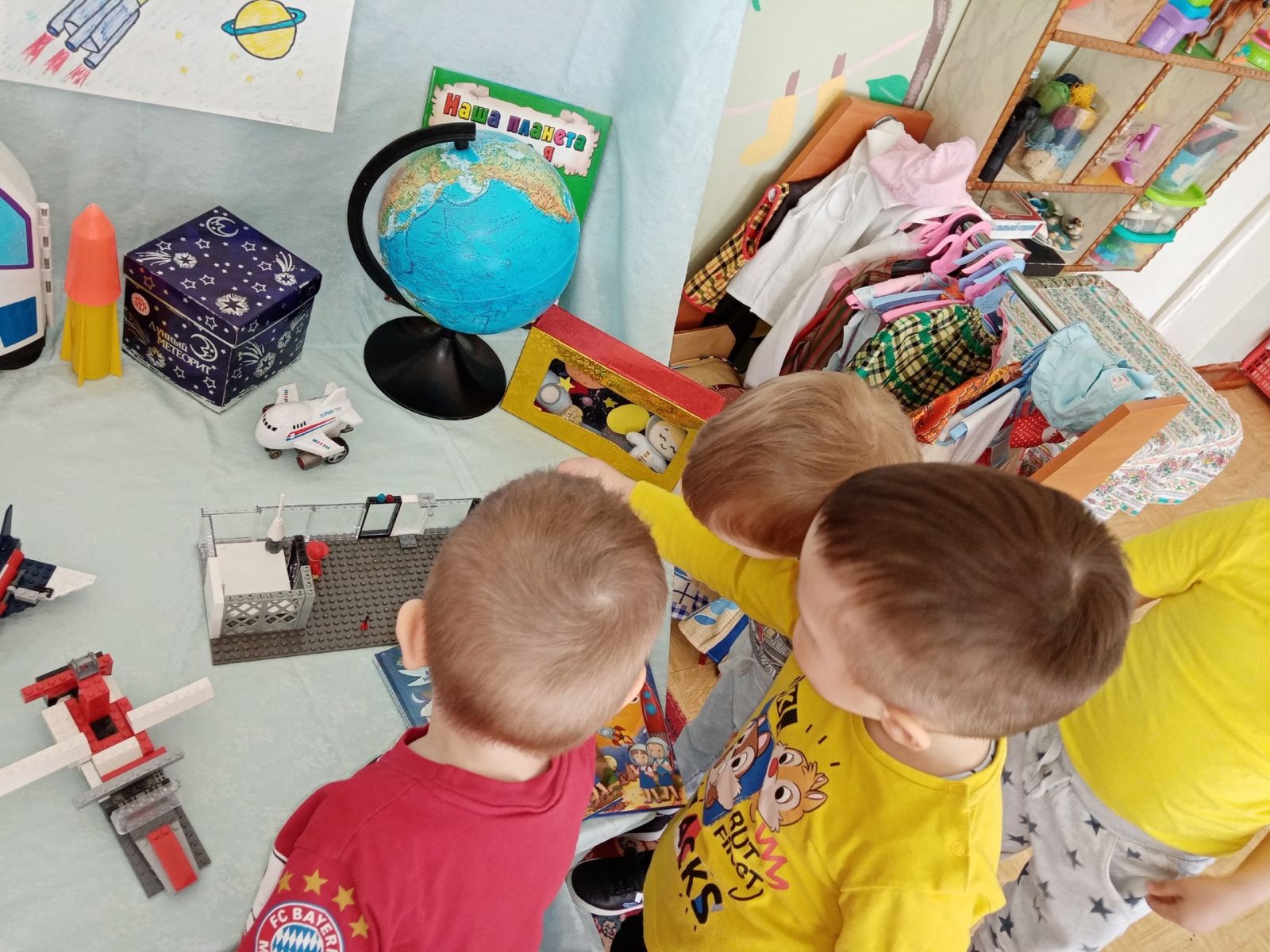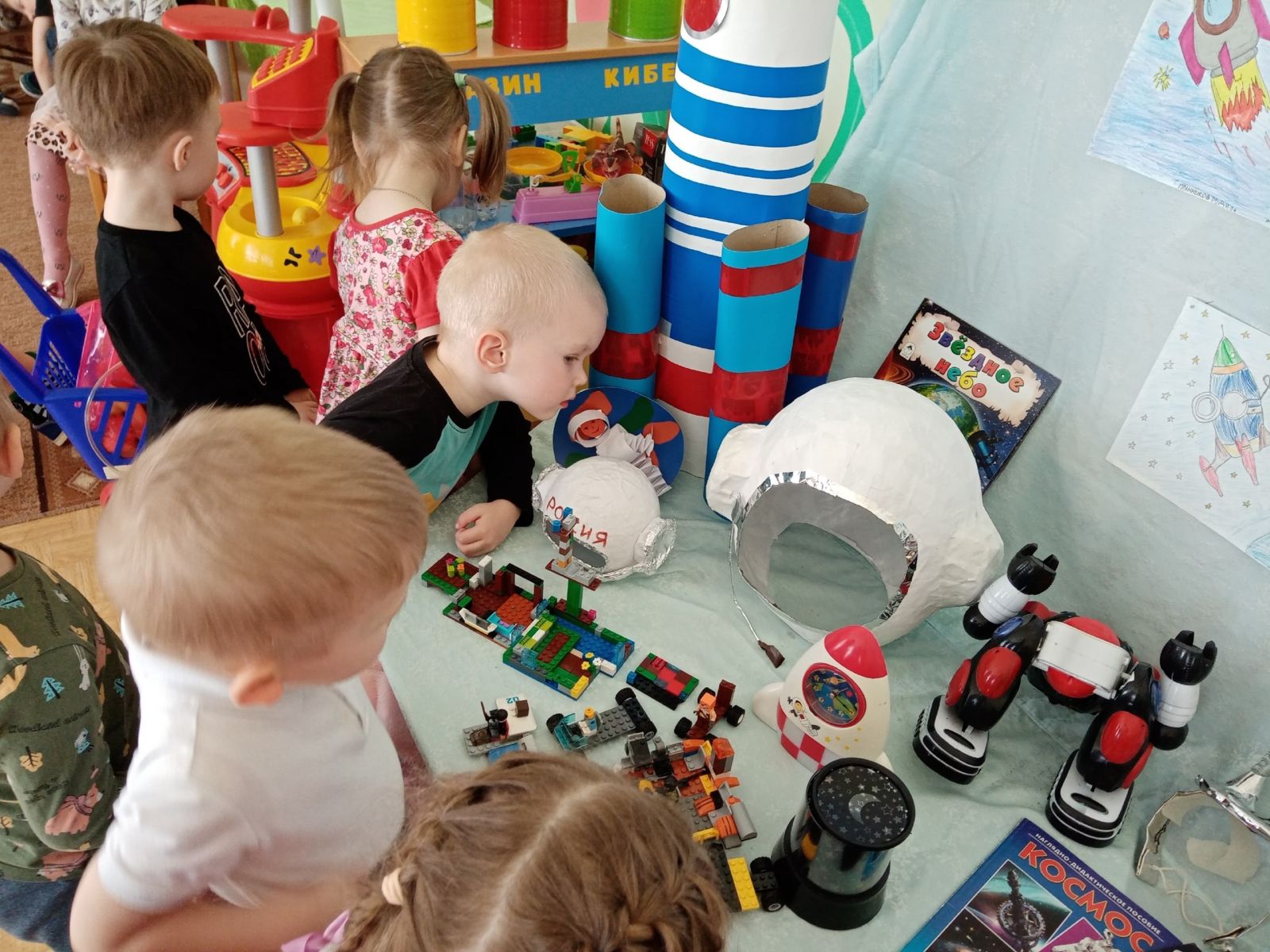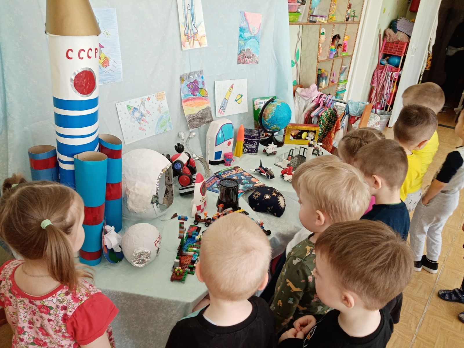 Сегодня малыши группы "Тамчыкай" посетили музей космоса, созданный силами родителей и детей нашего детского сада ко Дню космонавтики. воспитатели дали детям первичные представления о космических кораблях, звёздах, космосе; формировали представление ребят о планете Земля; расширили знания дошколят о профессии лётчика, космонавта. Педагоги познакомили ребят с первым космонавтом Ю. А. Гагариным. А на занятии по рисованию наши воспитанники с удовольствием рисовали ракету.