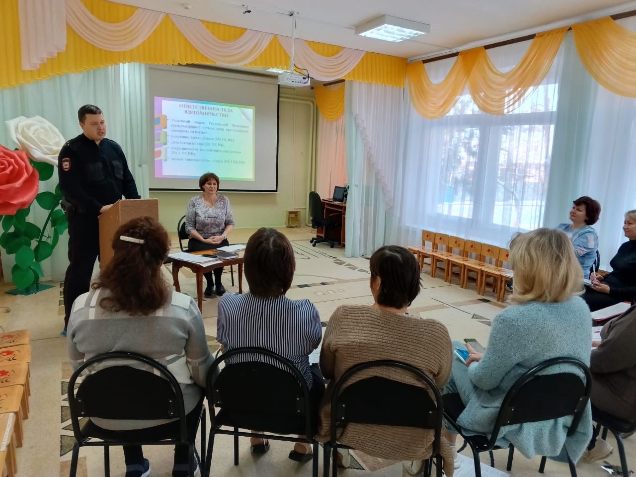 Опубликовано: 07.12.20237 декабря в музыкальном зале Детского сада № 8 "Василек" прошло собрание трудового коллектива, приуроченного к Международному Дню борьбы с коррупцией. Перед собравшимися выступил участковый уполномоченный полиции (ОУУП и ПДН) от МВД России по Бугульминскому району Данилов Андрей Викторович. Он осветил вопросы пресечения коррупционных правонарушений.