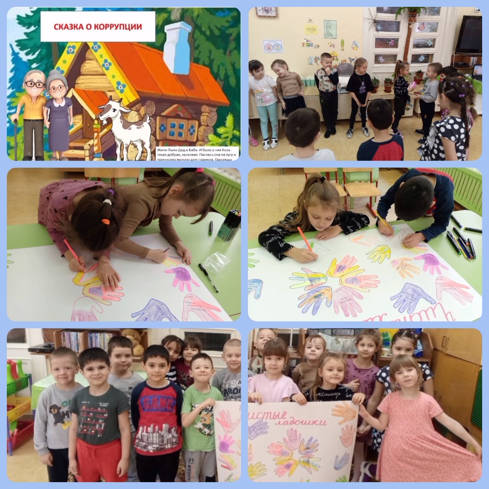 В ходе мероприятия велась беседа о коррупции, о её признаках и причинах возникновения. Дети получили доступную информацию о вреде коррупции с помощью сказки «Как коза с коррупцией повстречалась». Детям задавались вопросы по сюжетам сказки и обсуждалась каждая ситуация и поступки героев.
