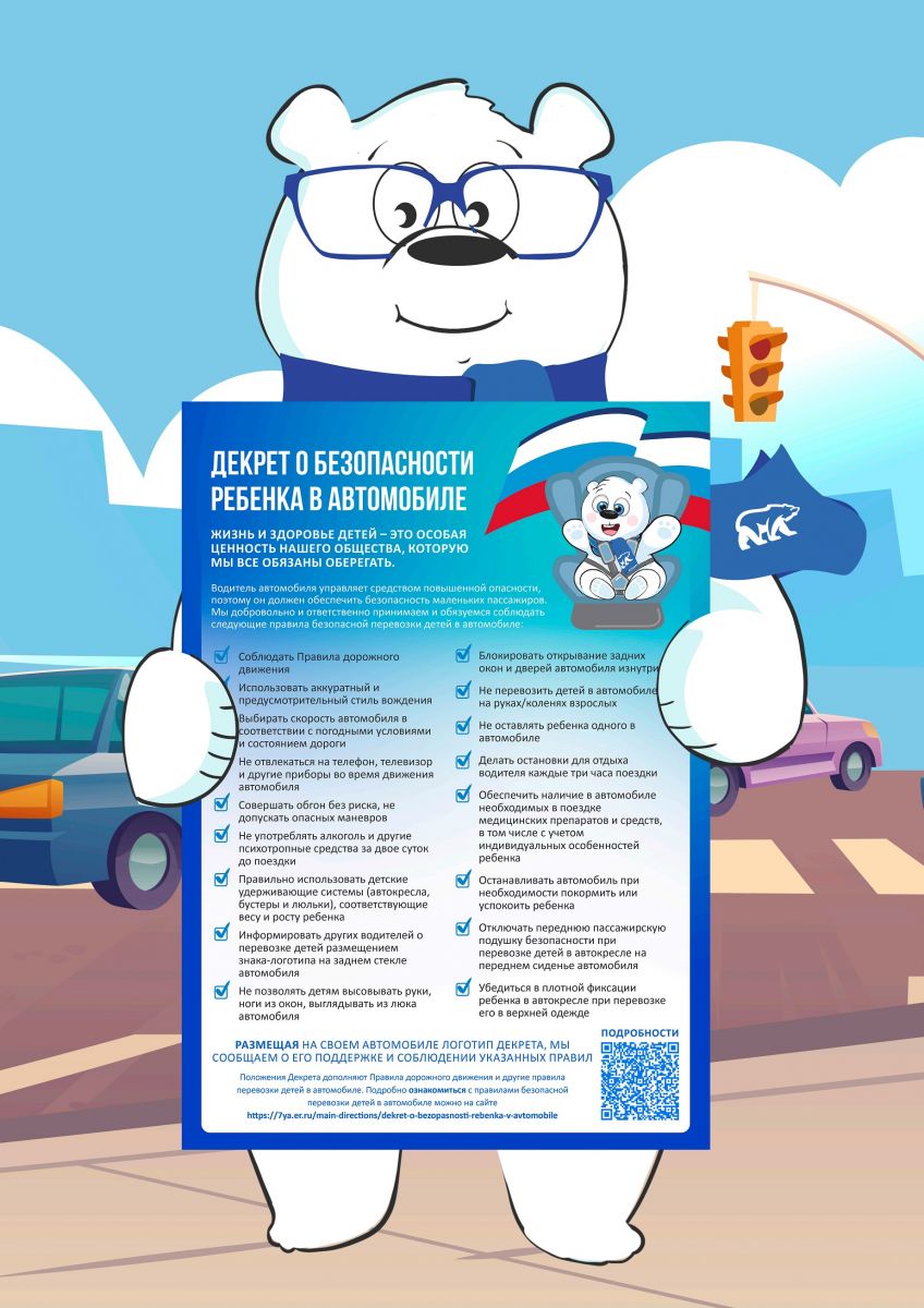 изготовление и размещение в общественных местах учреждений здравоохранения (детские поликлиники, перинатальные центры, родильные дома) плаката с Декретом о безопасности перевозки детей – до 28 июня 2024 года;