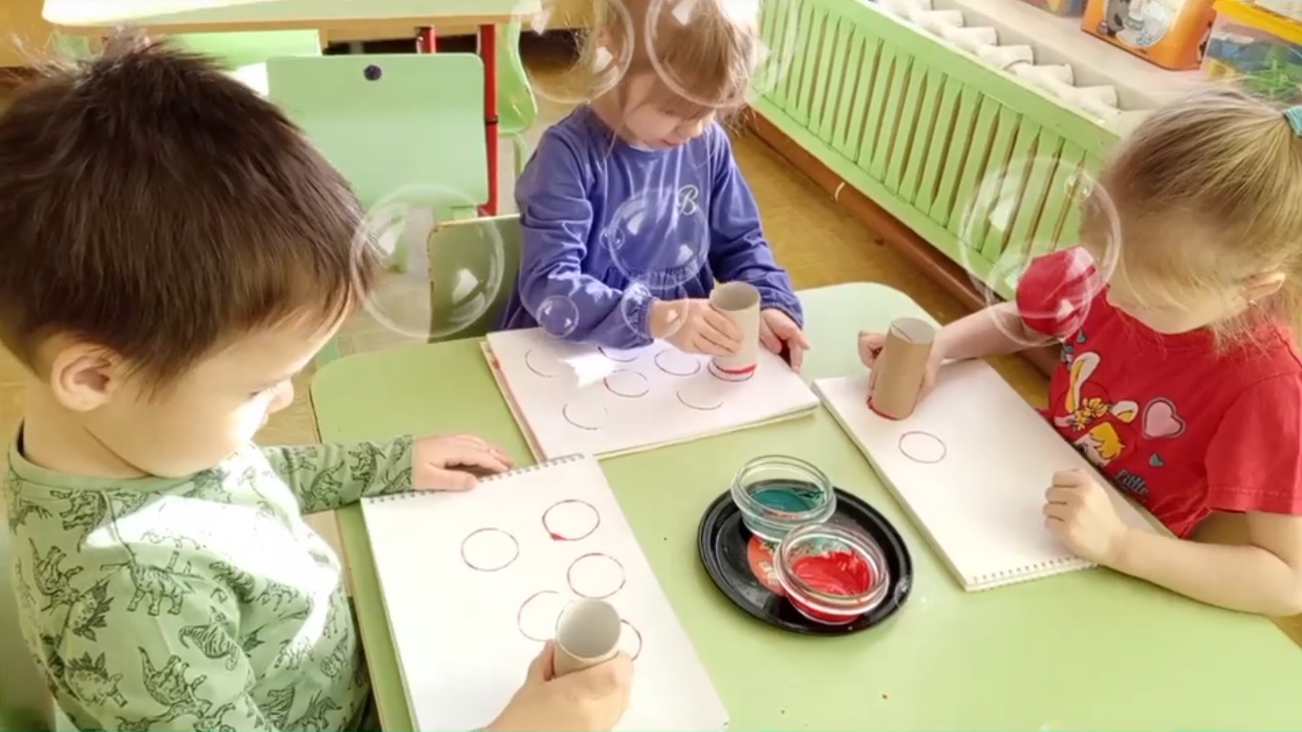 Поэтому мы решили сохранить яркие разноцветные мыльные шары на бумаге. Для этого мы использовали метод «штампанирования». В качестве штампа были использованы бумажные втулки! Метод «штампинга» способствует развитию восприятия формы, величины и цвета предметов, учит ориентироваться на листе бумаги, развивает моторику рук, творческое воображение, воспитывает самостоятельность, аккуратность при работе с красками. (Смотреть видео!)