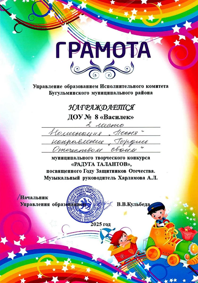 Гала-концерт стал настоящим зрелищем! От всей души поздравляем наших девочек Насонову Радалию, Алехину Стефанию, Индирякову Еву, занявших 2 место в этом творческом конкурсе с песней "Моя Россия", в номинации "Песня" в направлении "Гордись Отечеством своим!" Победа стала возможна благодаря талантам и стараниям детей, а также поддержке их музыкального руководителя — Харламовой Анжелики Львовны.
