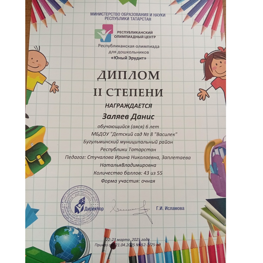 29 марта 2025 года, на базе средней школы № 6 прошла Республиканская олимпиада для дошкольников "Юный Эрудит". В Олимпиаде приняли участие и наши воспитанники подготовительной группы "Сказка" (воспитатели: Горбунова Н.Г., Стучалова И.Н., старший воспитатель Заплетаева Н.В.). Ребята старались выполнять задания, которые носят характер повышенной сложности и требуют от ребёнка внимания и углубленного знания предметов.