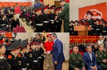 Торжественная церемония вступления кадет Бугульминской кадетской школы-интернат им. Героя Советского Союза Газинура Гафиатуллина в ряды Всероссийского военно-патриотического общественного движения ЮНАРМИЯ. Лучшим кадетам, вступившим в ряды юнармейцев, нагрудные знаки вручили Глава Бугульминского муниципального района, мэр города Бугульмы Линар Рустамович Закиров и военный комиссар РТ, генерал-майор Сергей Николаевич Погодин. -