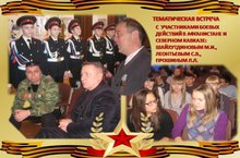 Во Дворце школьников прошла тематическая встреча с участниками боевых действий в Афганистане и Северном Кавказе: Шайхутдинов М.И., Леонтьев С.В., Прошин Л.Л.. Они поделились с ребятами своими воспоминаниями, рассказали про жизнь обычных людей во время конфликта в Афганистане, про быт солдат того времени, о событиях чеченской кампании.