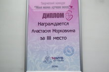 В творческом конкурсе «Моя мама лучше всех», проводимом МУП «Бугульма-Медиа» и посвященном Международному дню матери, две гимназистки стали призерами. Алия Бикташева награждена Дипломом I степени и Анастасия Морковкина – Дипломом III степени. Также им вручены Сертификаты на бесплатное посещение кинотеатра «Мадагаскар». Поздравляем талантливых гимназисток и желаем им новых творческих успехов.