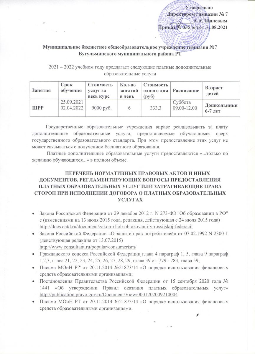 Прейскурант на платные дополнительные образовательные услуги (ШРР) в 2021-2022 учебном году