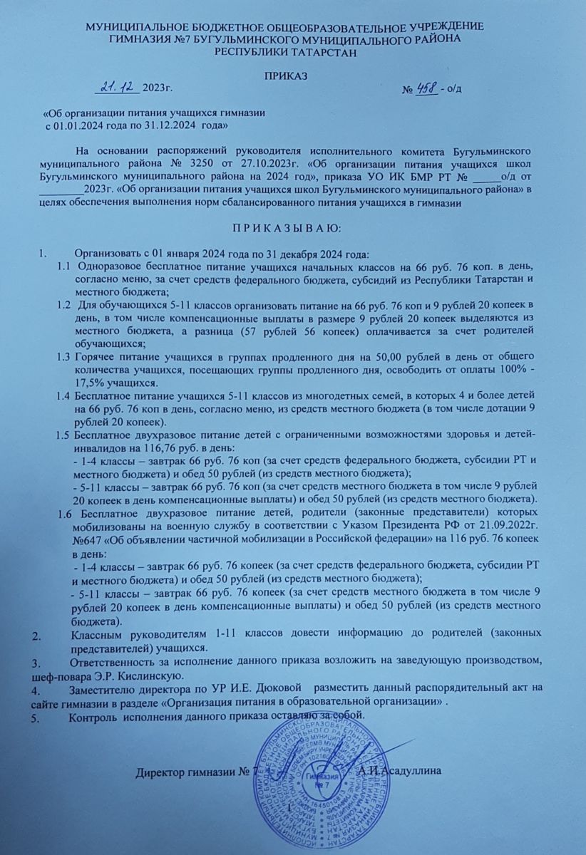 Приказ об организации питания учащихся гимназии в 2024 году