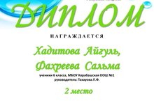 С целью формирования экологической культуры школьников, приобщения их к охранной деятельности водных источников, Детский эколого-биологический центр г.Бугульма провёл муниципальную экологическую акцию "Всемирный день воды". Учащиеся 6 класса МБОУ Карабашской основной школы №1 Фахреева Сальма и Хадитова Айгуль приняли участие в конкурсе экологического плаката "H2O" и заняли 2 место! Руководитель: Тахауова Лейсан Халиловна.