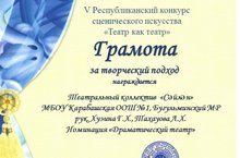 Театральный коллектив "Сәйлән" МБОУ Карабашской основной школы №1 Бугульминского муниципального района РТ принял участие в V Республиканском конкурсе сценического искусства "Театр как театр" и был награжден грамотой за творческий подход в номинации "Драматический театр". Руководители коллектива: Хузина Гузалия Хатиповна и Тахауова Лейсан Халиловна