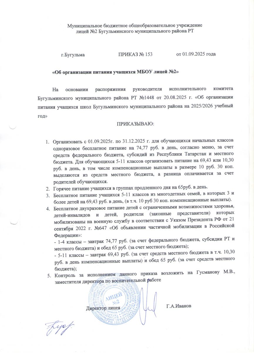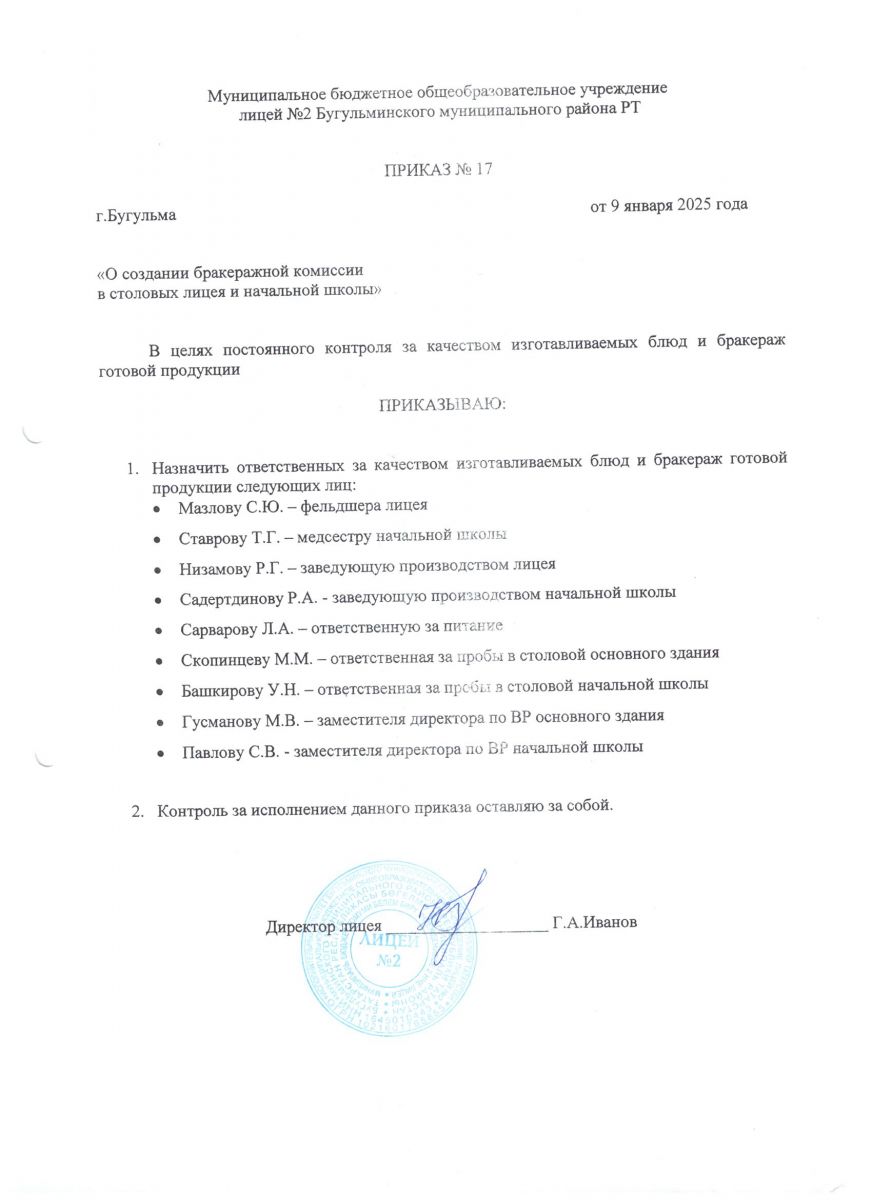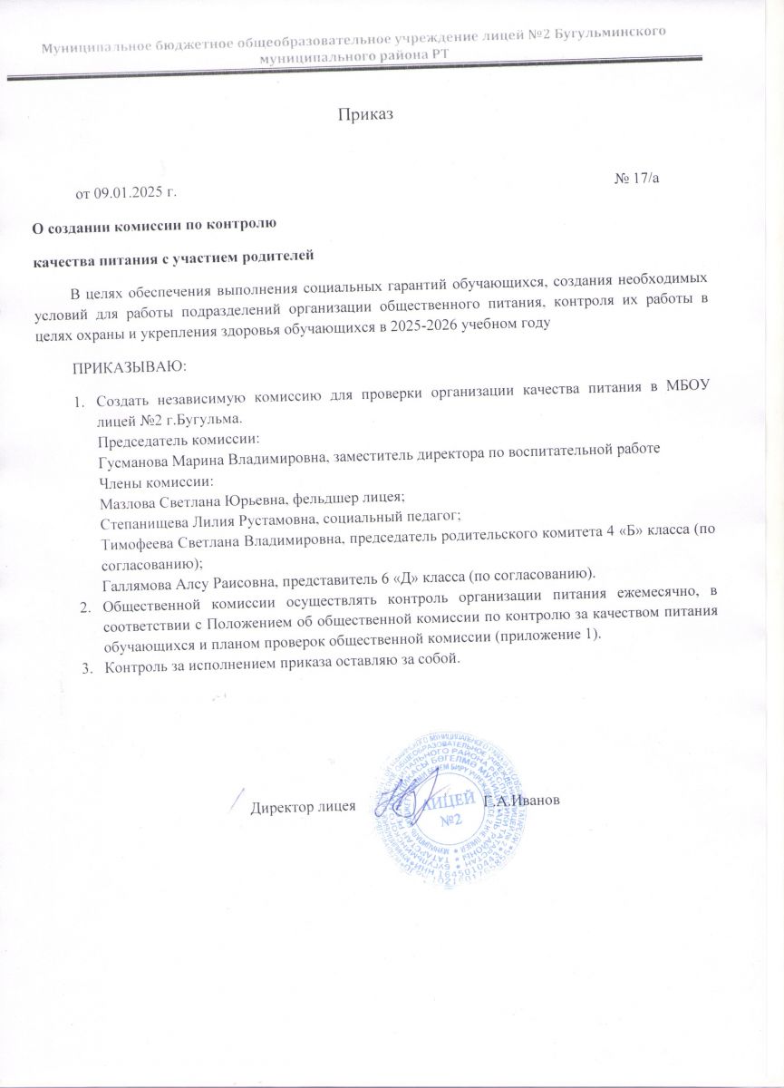 Приказ о создании комиссии по контролю качества питания с участием родителей 2023-2024