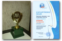 Коллектив МБОУ лицея №2 г.Бугульмы, а также Министерство образования и науки Республики Татарстан выражает благодарность Иванниковой Ольге Вениаминовне, учителю биологии, за подготовку лауреата премии для поддержки талантливой молодежи в рамках приоритетного национального проекта "Образование".