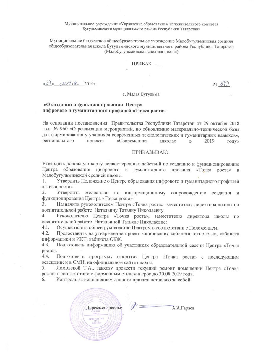 приказ О создании Центра цифрового и гуманитарного профилей "ТОЧКА РОСТА".