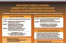 Военный университет радиоэлектроники - один из ведущих технических вузов Министерства обороны Российской Федерации , расположен в г. Череповце Вологодской области. Университет готовит технических специалистов в области радиоэлектроники, вычислительной техники и информационно-аналитических технологий обработки данных по программам высшего и средне-специального образования. Видеоролик о Военном ордена Жукова университете радиоэлектроники доступен по ссылке:
