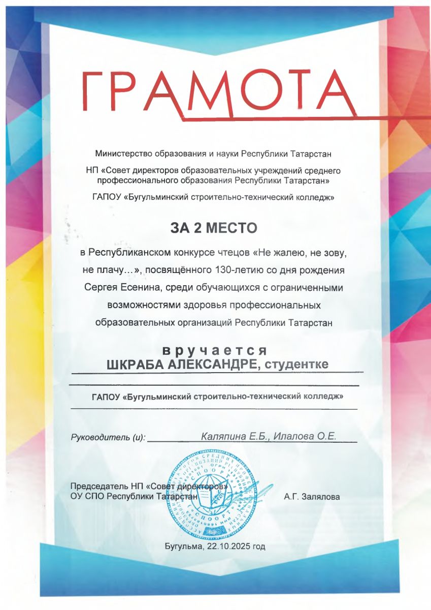 В соответствии с планом работы Ассоциации директоров средних профессиональных образовательных организаций Республики Татарстан на 2025-2026 учебный год на базе ГАПОУ «Бугульминский строительно-технический колледж» состоялся Республиканский конкурс чтецов «Не жалею, не зову, не плачу…», посвященный 130-летию со дня рождения русского поэта Сергея Есенина, среди обучающихся с ограниченными возможностями здоровья профессиональных образовательных организаций Республики Татарстан.
