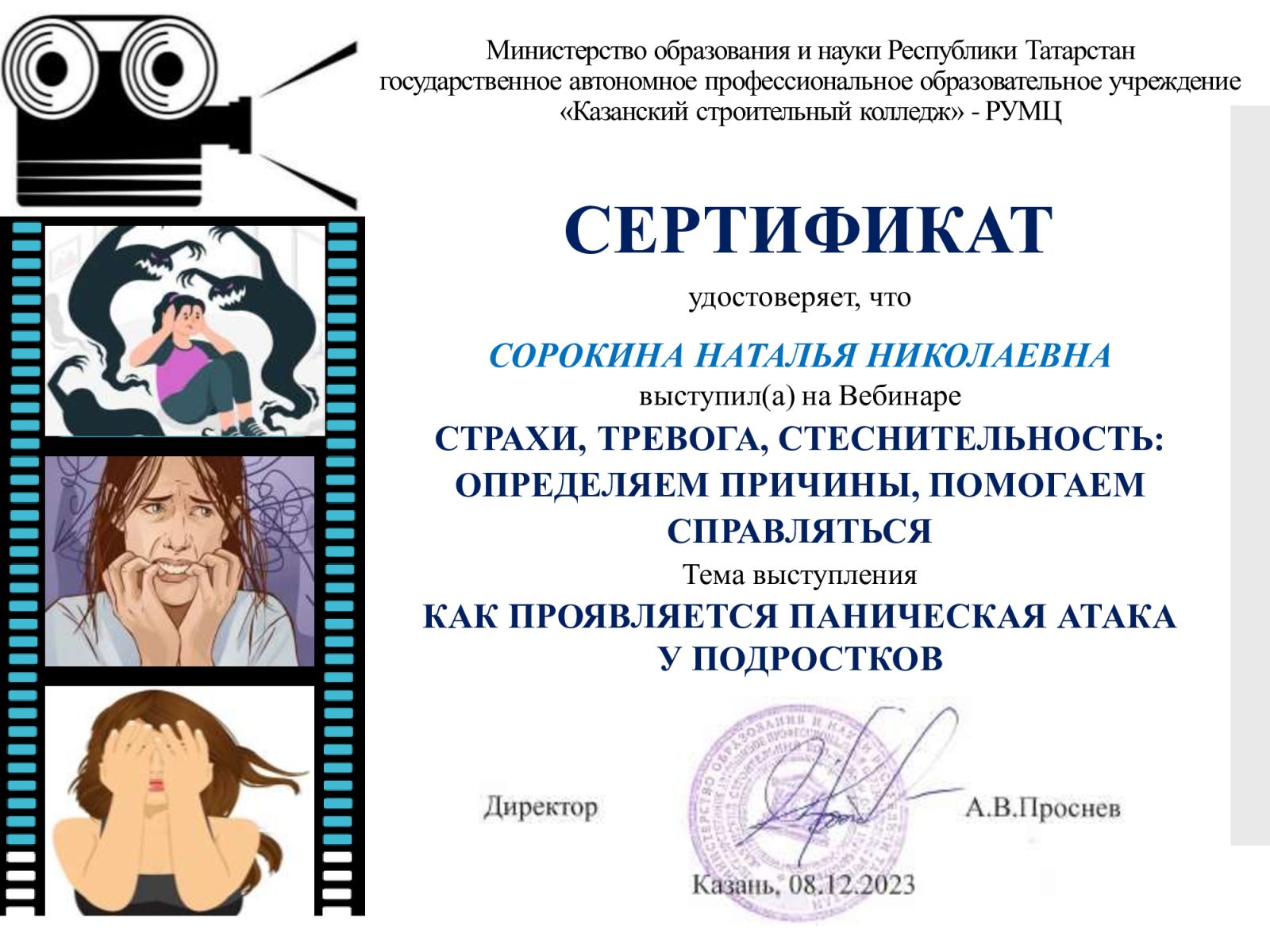 08 декабря 2023 года состоялся межрегиональный онлайн-вебинар на тему: «Страхи, тревога, стеснительность: определяем причины, помогаем справляться». Организатор мероприятия - ГАПОУ «Казанский строительный колледж» - РУМЦ СПО; участники: социальные педагоги, психологи и педагогические работники и профессиональных образовательных организаций, представители базовых профессиональных организаций и ресурсных учебно-методических центров Российской Федерации.
