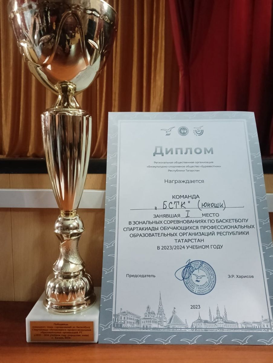 1 место в зональных соревнованиях по баскетболу Спартакиады обучающихся профессиональных образовательных организаций Республики Татарстан в 2023/2024 учебном году.