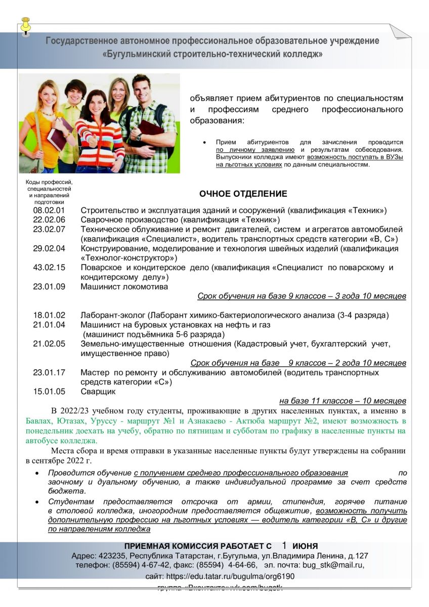 Государственное автономное профессиональное образовательное учреждение "Бугульминский строительно-технический колледж" / Дәүләт автоном һөнәри белем бирү учреждениясе “Бөгелмә төзелеш-техник көллияте”