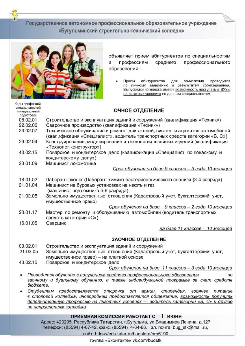 Бугульминский строительно-технический колледж предлагает получить специальность или профессию.