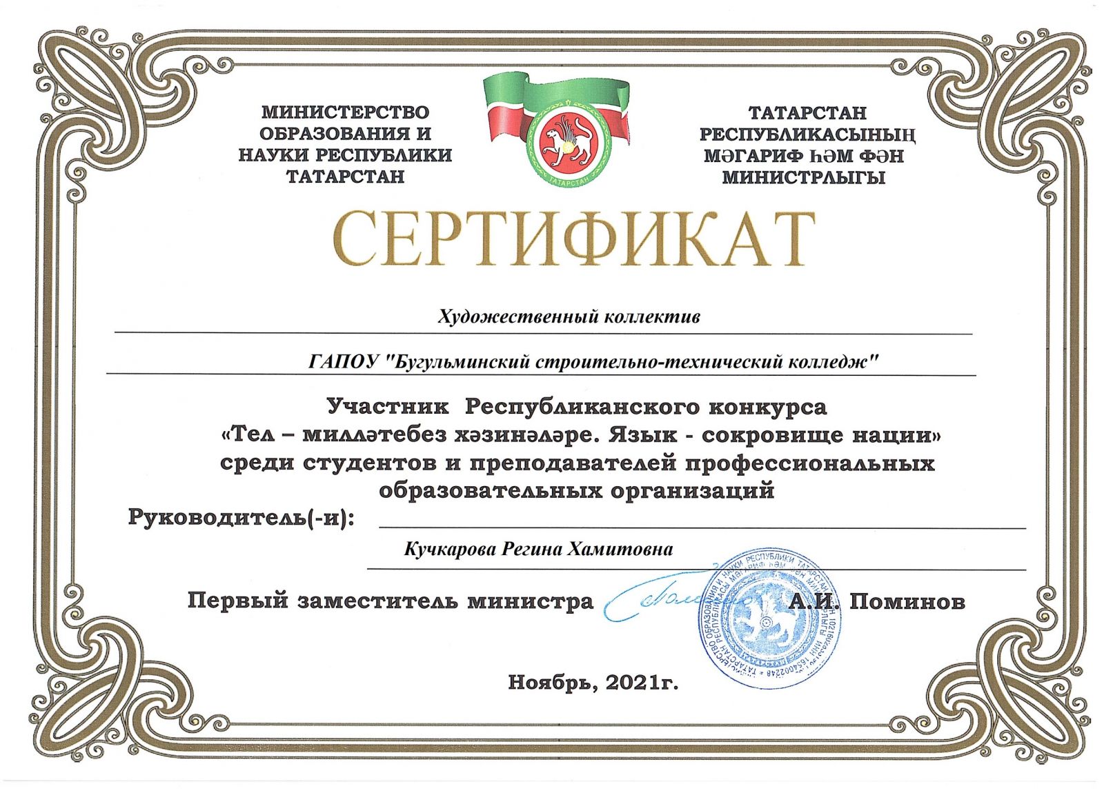 В Республиканском конкурсе по татарскому языку «Тел-милләтебез хәзинәләре. Язык-сокровище нации» среди студентов и преподавателей профессиональных образовательных организаций приняли активное участие студенты профессии «Машинист на буровых установках» Афлятунов Азамат и Хабипов Ирек., студентка по профессии «Лаборант-эколог» Гимаева Гузель. Преподаватель Кучкарова Р.Х. подготовила студентов к этому конкурсу и совместно одержали победу! Студенты показали хорошее актерское мастерство в сценке «Балага исем кушу йоласы/Обряд наречения имени ребенку». Театральная зарисовка «Традиции татарского народа» удалась!