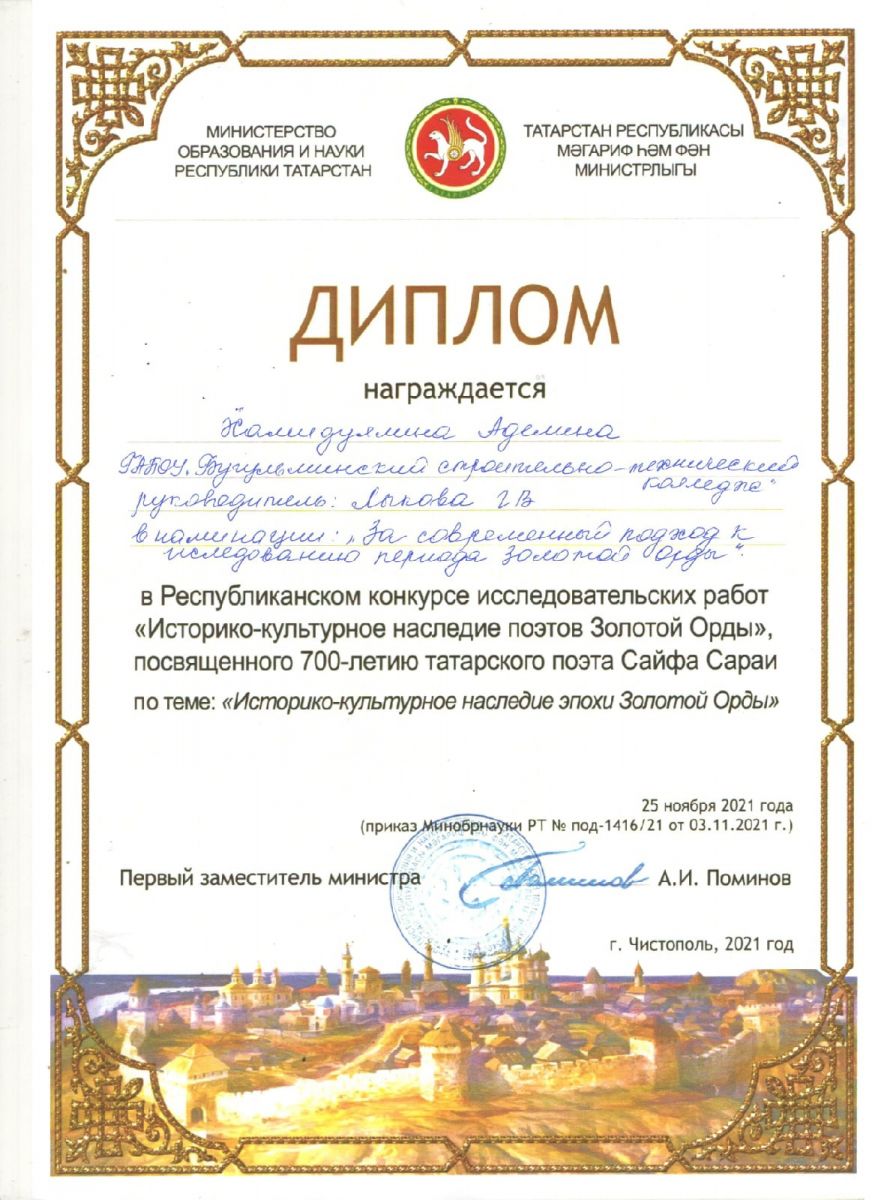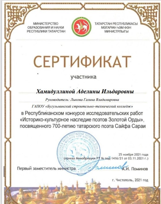 По итогам конкурса студентка Бугульминского строительно-технического колледжа Хамидуллина Аделина победила в номинации «За современный подход в исследовании периода Золотой Орды». Руководила проектной работой студентки преподаватель колледжа Галина Владимировна Лыкова.