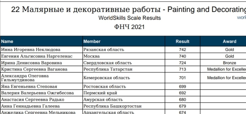 Чтобы стать участником Финала Национального чемпионата WSR 2021 года, мы в ноябре 2020 года одержали победу на Региональном чемпионате Региональный чемпионат по компетенции «Малярные и декоративные работы», прошли отборочный этап, где пришлось соревноваться с 40 регионами. И вот, он - Национальный чемпионат "Молодые профессионалы" в городе Уфа, который проходит с 25-29 августа 2021г. Наш регион представляет Ваганова Кристина (призер Национального чемпионата 2020г. Юниор). Большую работу провели тренеры Петрова Надежда Николаевна и Шальнова Наиля Викторовна во главе с директором "Бугульминского строительно- технического колледжа" Масловым Александром Сергеевичем. Сегодня уже начались соревнования. Давайте пожелаем Кристине удачи и возвращение с чемпионата с медалью.