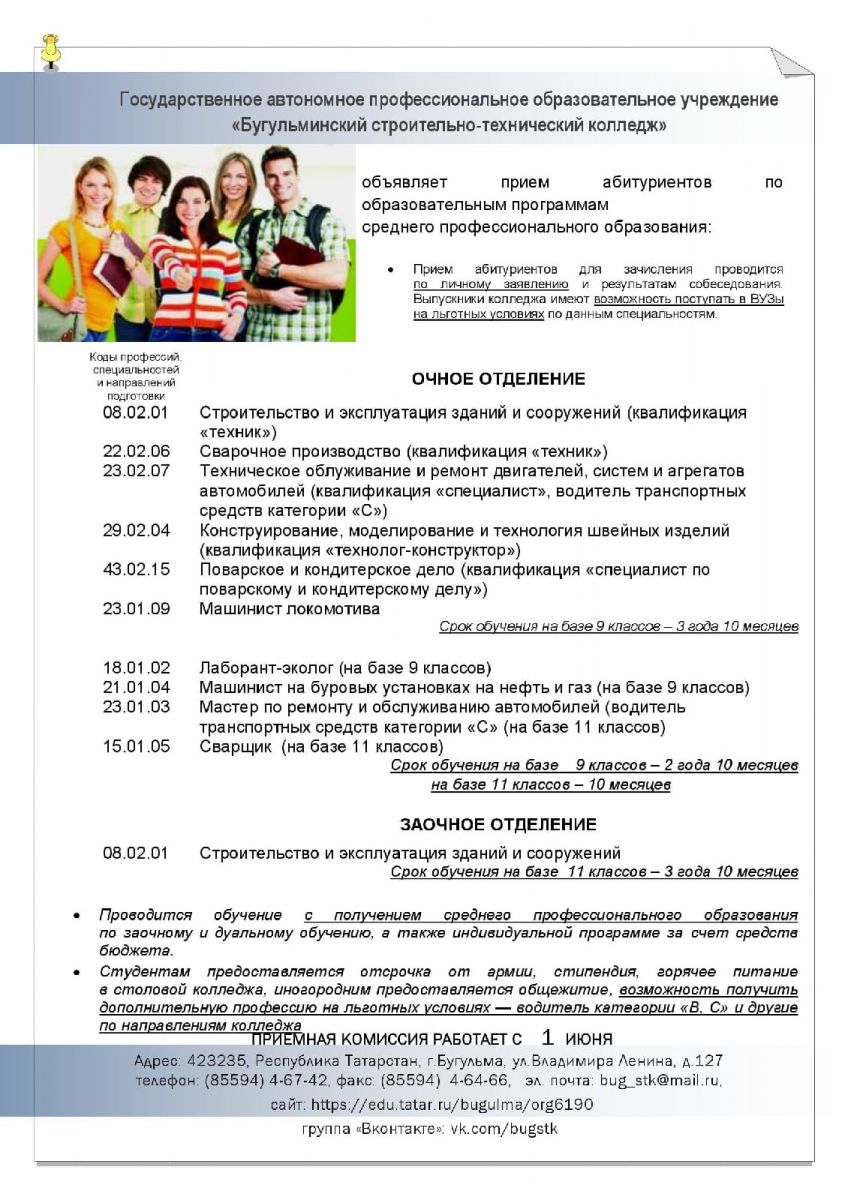 Бугульминский строительно-технический колледж приглашает абитуриентов 22.03.2021