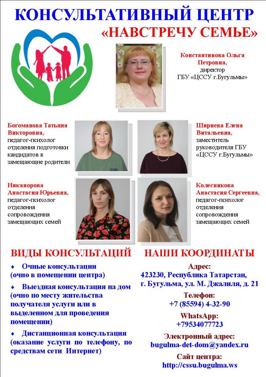 ГБУ "Центр содействия семейному устройству детей, оставшихся без попечения родителей, подготовки и сопровождения замещающих семей г. Бугульмы" (далее Центр) является консультационным центром "Навстречу семье" в рамках федерального проекта "Поддержка семей, имеющих детей" национальном проекте "Образование". Данный проект направлен на создание условий для повышения компетентности родителей в вопросах развития, воспитания и образования, путем предоставления бесплатных консультаций гражданам, имеющих несовершеннолетних детей в возрасте от 0 до 18 лет.
