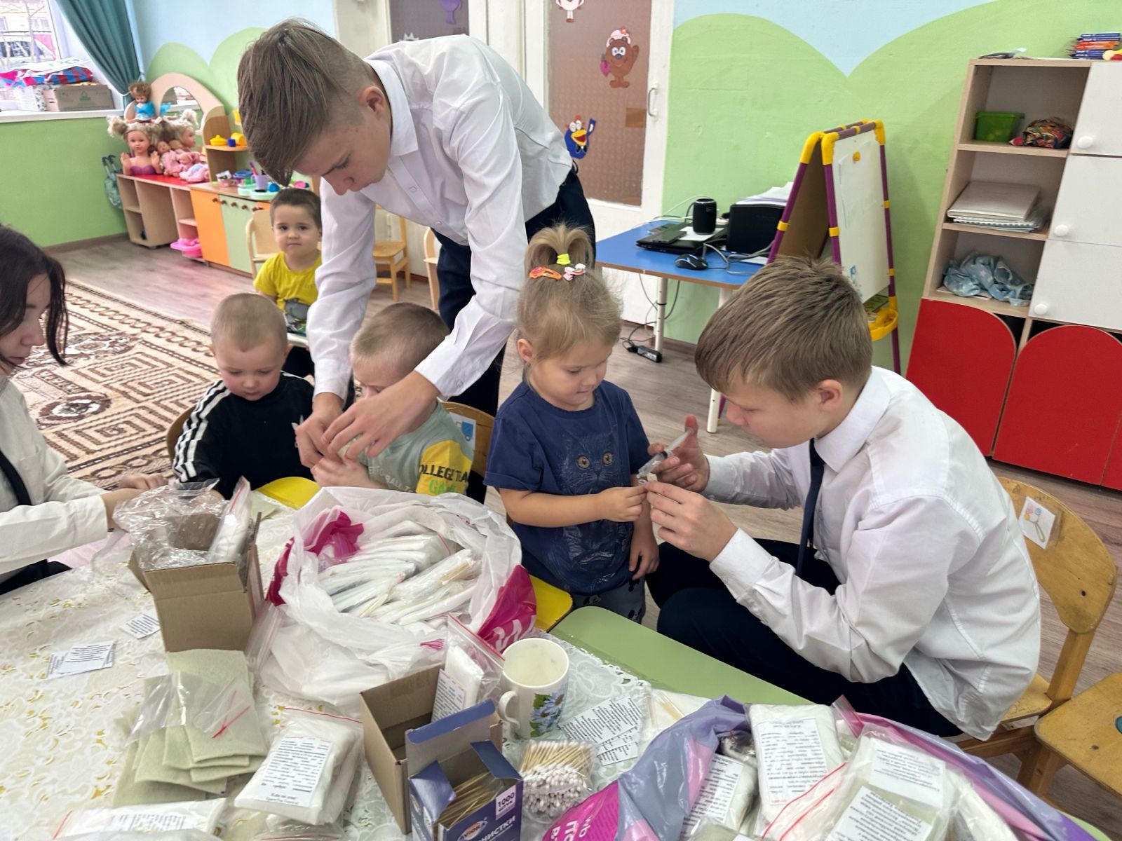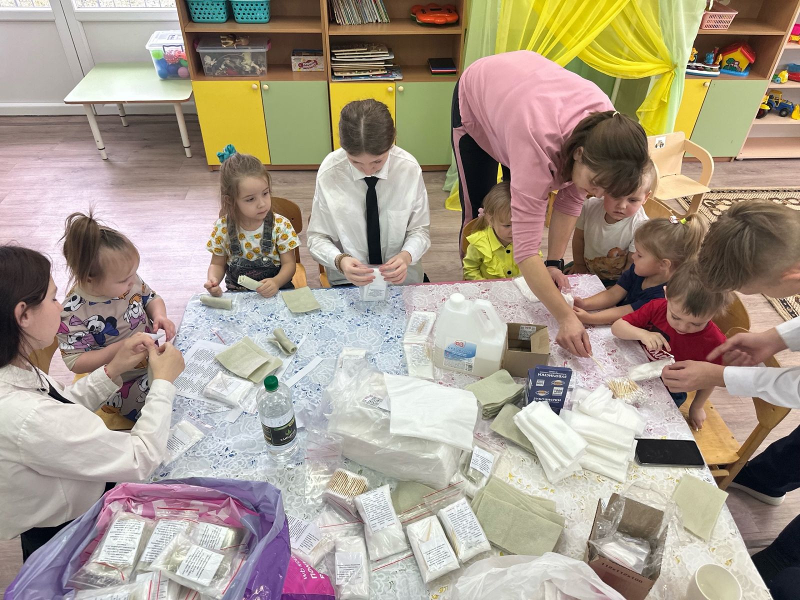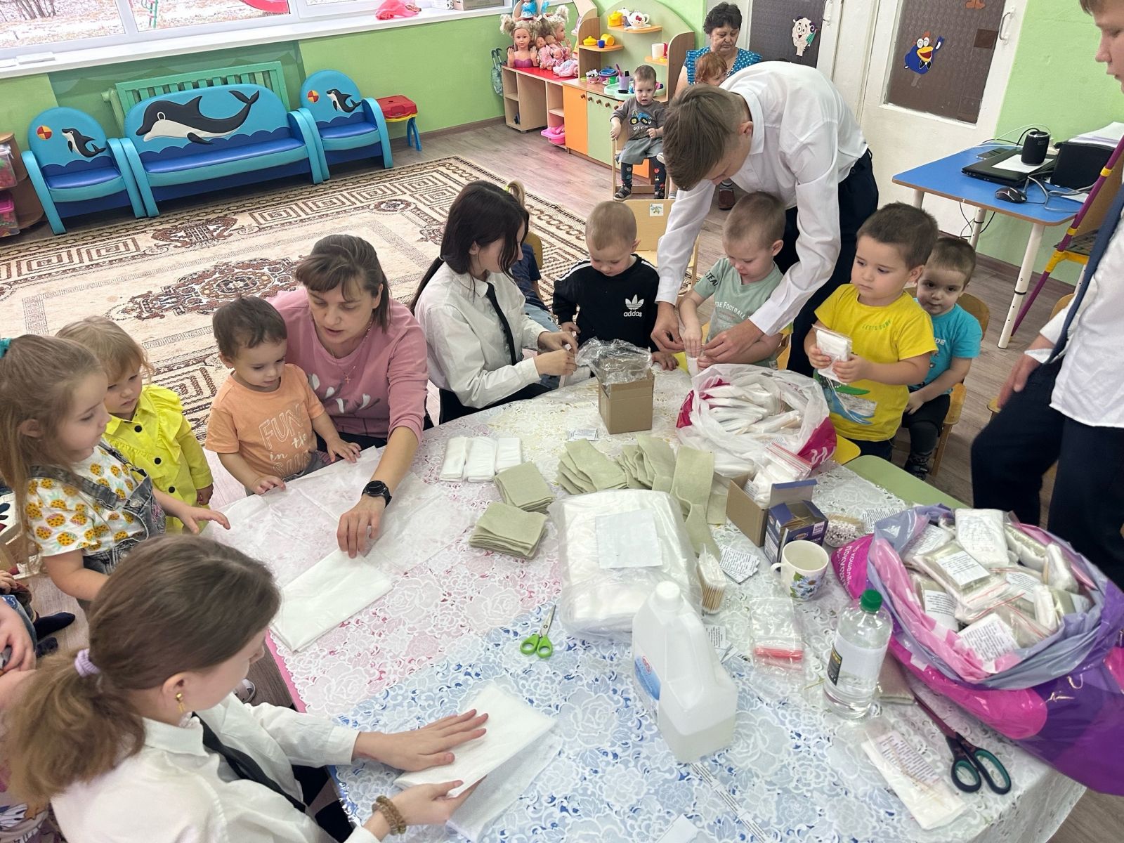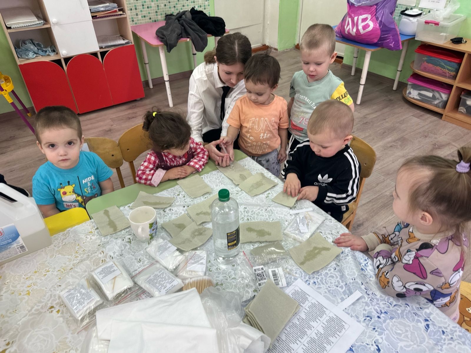 Сегодня советник директора по воспитанию, Низамутдинова Н.В. и обучающиеся ГБОУ «Сокольская школа- интернат для детей с ОВЗ» провели для воспитателя Скарлыгиной М. Н. и воспитанников разновозрастной группы (с 1года до 4 лет) «Озорные бабочки» (МБДОУ Малобугульминский детский сад общеразвивающего вида "Ягодка" Бугульминского муниципального района Республики Татарстан) мастер-класс по изготовлению сухого душа для участников специальной военной операции. Можно ли принять душ, находясь в полевых условиях? Оказывается, да. Если это – сухой душ. Сухой армейский душ – это гигиенический набор, в состав которого входит одноразовое полотенце и губка (из агроволокна дорнит), пропитанная специальным медицинским средством. При небольшом количестве воды (30-50 мл), она даёт обильную пену, которая очищает кожу и не требует смывания водой. Каждый день наши «Добротворцы» помогают взрослым. Волонтёры совмещают учёбу и формирование посылок в зону специальной военной операции. Мы расширяем состав добровольцев, вовлекая и детей раннего возраста, воспитывая в них чувство патриотизма. Бок о бок со старшими наставниками юные добровольцы осваивают новые навыки. Складывая полотенца своими маленькими ручками, они посылают нашим бойцам свое тепло! Собирая совместно с воспитателем, Скарлыгиной М.Н., набор сухого душа малыши даже не подозревают какой вклад в большое дело они вносят, помогая нашим героям, тем самым приближая победу!