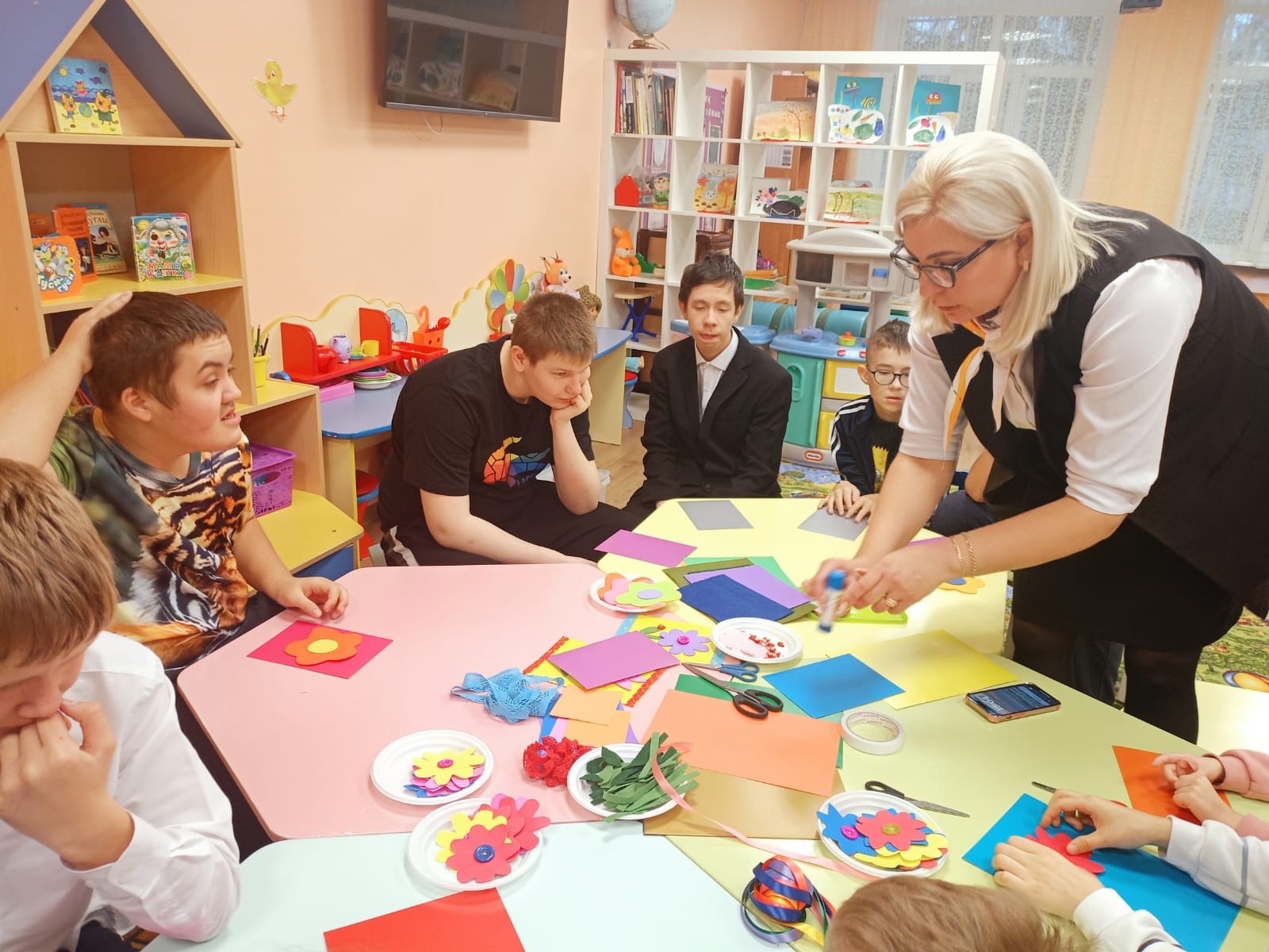 Советник директора по воспитанию, Низамутдинова Н.В., совместно с волонтерским отрядом «Добротворцы» ГБОУ «Сокольская школа- интернат для детей с ОВЗ» провели мастер - класс для воспитанников Государственного автономного учреждения социального обслуживания «Реабилитационный центр для детей и подростков с ограниченными возможностями «Возрождение». В преддверии праздника Дня Матери изготовление открытки - актуальное мероприятие. Мама – самый важный человек в нашей жизни и наш лучший друг, защитник, учитель, к которому мы идем за советом в трудную минуту и на которого мы можем положиться всегда и во всём! День матери – это замечательный, светлый и долгожданный праздник, в который дети любят преподносить своим мамам сюрпризы. А самый лучший подарок, как известно, тот, что сделан своими руками и от всей души! Открытка изготавливалась из картона, фетра, пористой резины, пуговичек, ажурной ленты и других материалов, все воспитанники с удовольствием работали клеевым пистолетом, ножницами, вкладывая в свою работу не только мастерство и терпение, но и, конечно же, и любовь к родному человеку. Все участники мастер-класса получили массу эмоций и хорошее настроение.