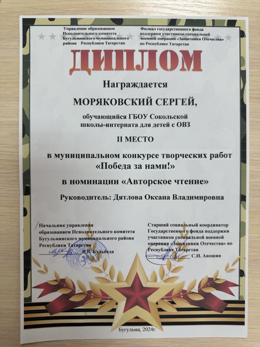 В очередной раз наши ребята награждены дипломами победителей I и II места в муниципальном конкурсе творческих работ "Победа за нами!", в номинациях: "Мини - сочинение: "Письмо солдату", "Авторское чтение". Ребята мы гордимся Вами! Вы большие молодцы!