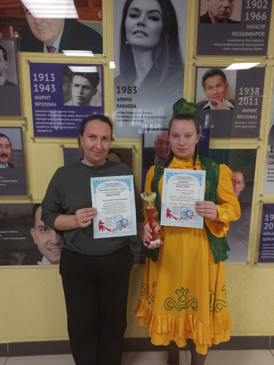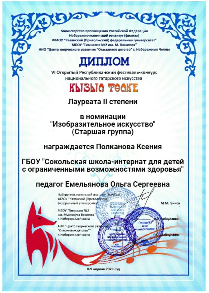 9 апреля 2023 года на базе МБОУ "Гимназия №2 им. Мулланура Вахитова" г. Набережные челны состоялся VI Открытый Республиканский фестиваль конкурс национального татарского искусства "Кызыл Телке"Борироса Алена ученица 6 класса стала лауреатом 3 степени в номинации "хореография" представив татарский народный танецПолканова Ксения ученица 9 класса стала лауреатом 2 степени в номинации "Изобразительное искусство" представив две работы на тему национальная культура Татарстана -