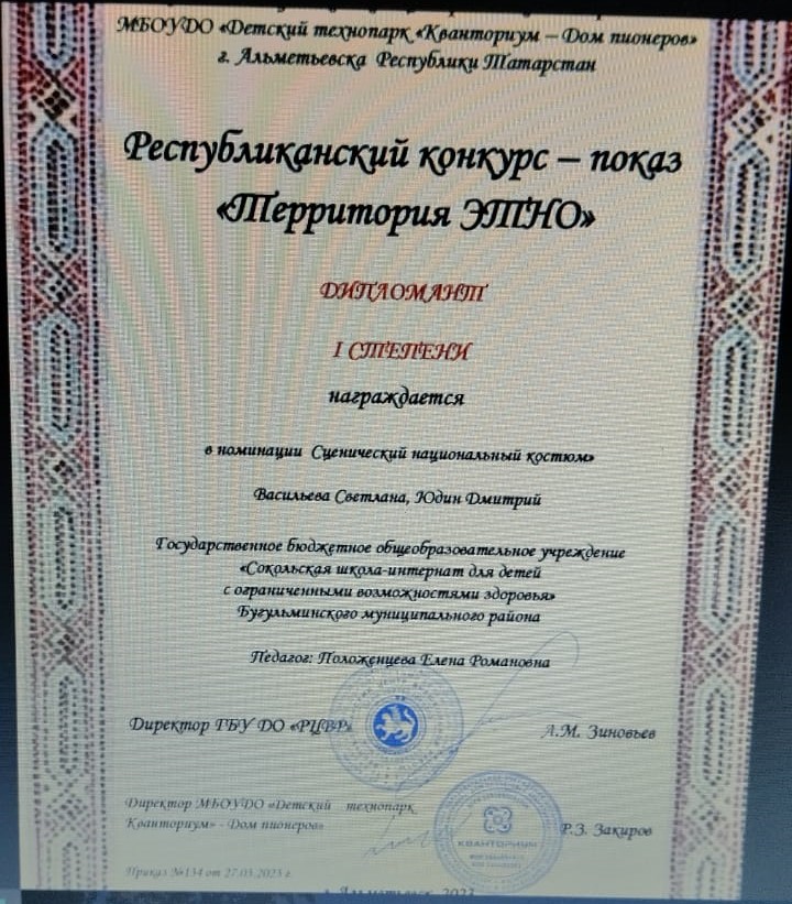 24 февраля в Бугульминском дворце Школьников проходил муниципальный этап национального фестиваля детского художественного творчества "Без бергә-2023" в нем приняли участия обучающиеся 8 класса Васильева Светлана и Юдин Дмитрий, которые заняли 1 место в номинации "Этно костюм". Руководитель ПОЛОЖЕНЦЕВА Е.Р. Фото1 Фото2 -