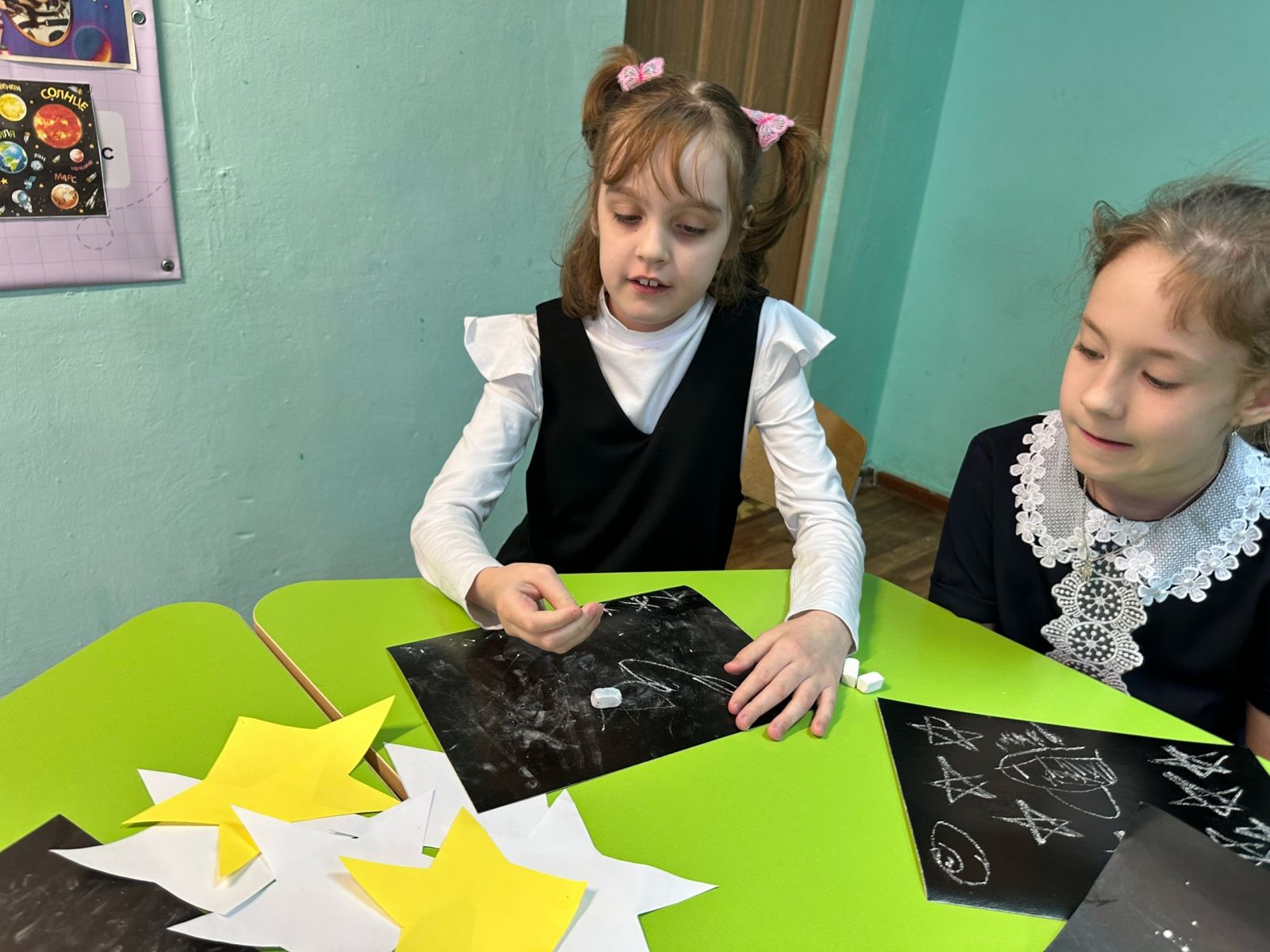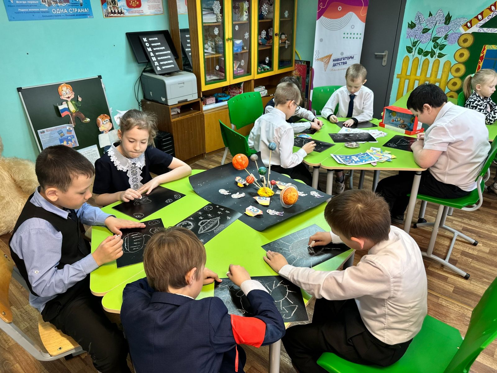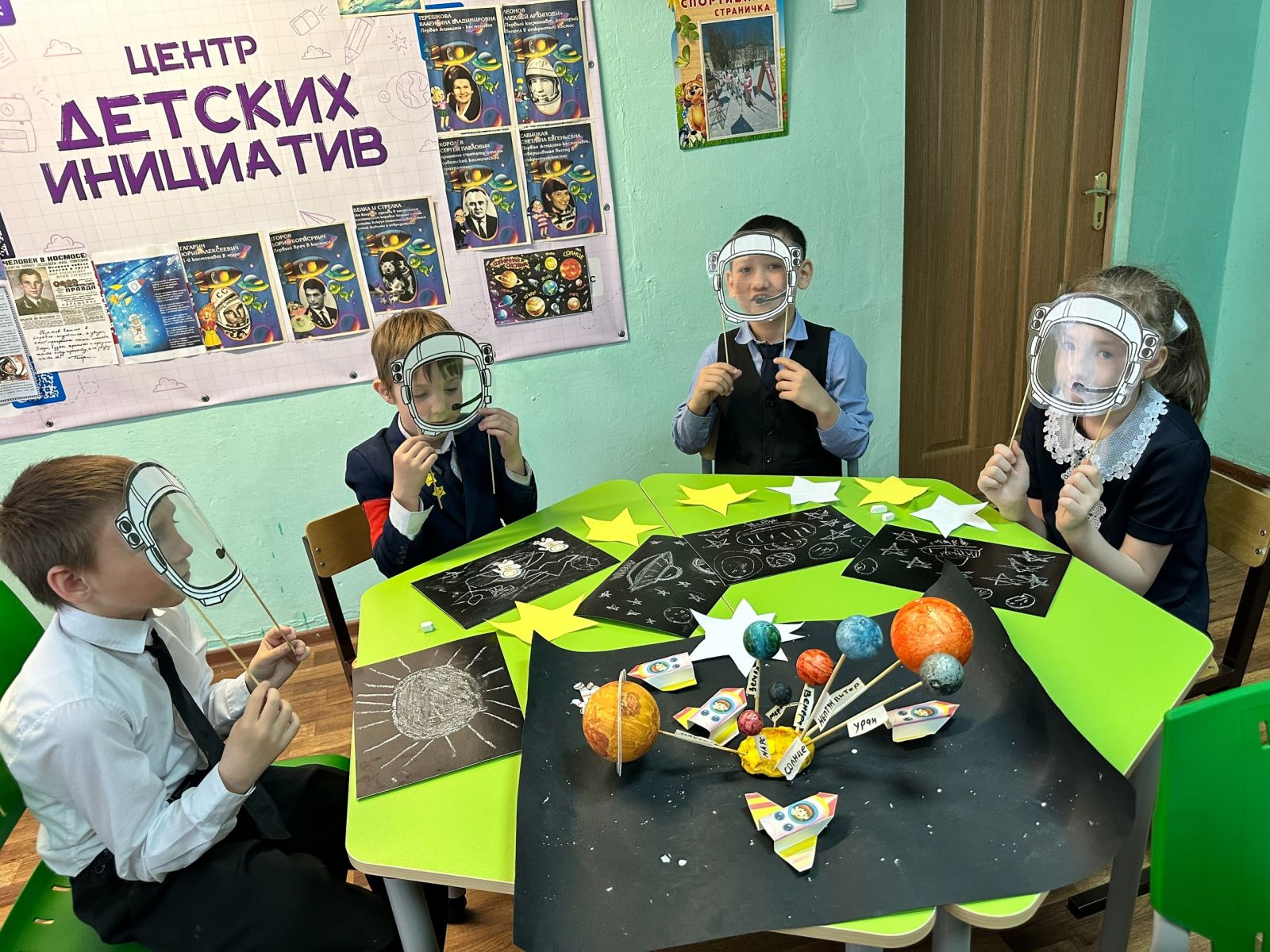 День космонавтики в нашей школе: Познавательное занятие «Покорители Вселенной»! В преддверии 12 апреля советник директора по воспитанию, Низамутдинова Н.В. с обучающимися начальной школы отметили День космонавтики, проведя увлекательное познавательное занятие. В рамках мероприятия с ребятами вспоминали о первых космонавтах, таких как Юрий Гагарин и Валентина Терешкова, а также о современных достижениях в исследовании космоса. Путешествуя по просторам Вселенной, воспитанники изучили созвездия «Лебедь», «Кассиопея», «Овен», «Лира», «Волосы Вероники», «Жираф» и другие. Мечтая о будущих космических путешествиях, «прихватив» с собой шлемы, мы отправились в полёт со словами «Поехали!». Наши ребята играли в лото: «Захватывающий космос», в игру «Полезная и вредная еда для космонавтов». В завершении занятия ребята создали рисунки мелом на черном картоне, изобразив ракеты, планеты, звезды, проявляя свою креативность и командный дух. Это мероприятие дало возможность заглянуть в бескрайние просторы Вселенной. Мы уверены, что среди наших обучающихся есть будущие покорители космоса!