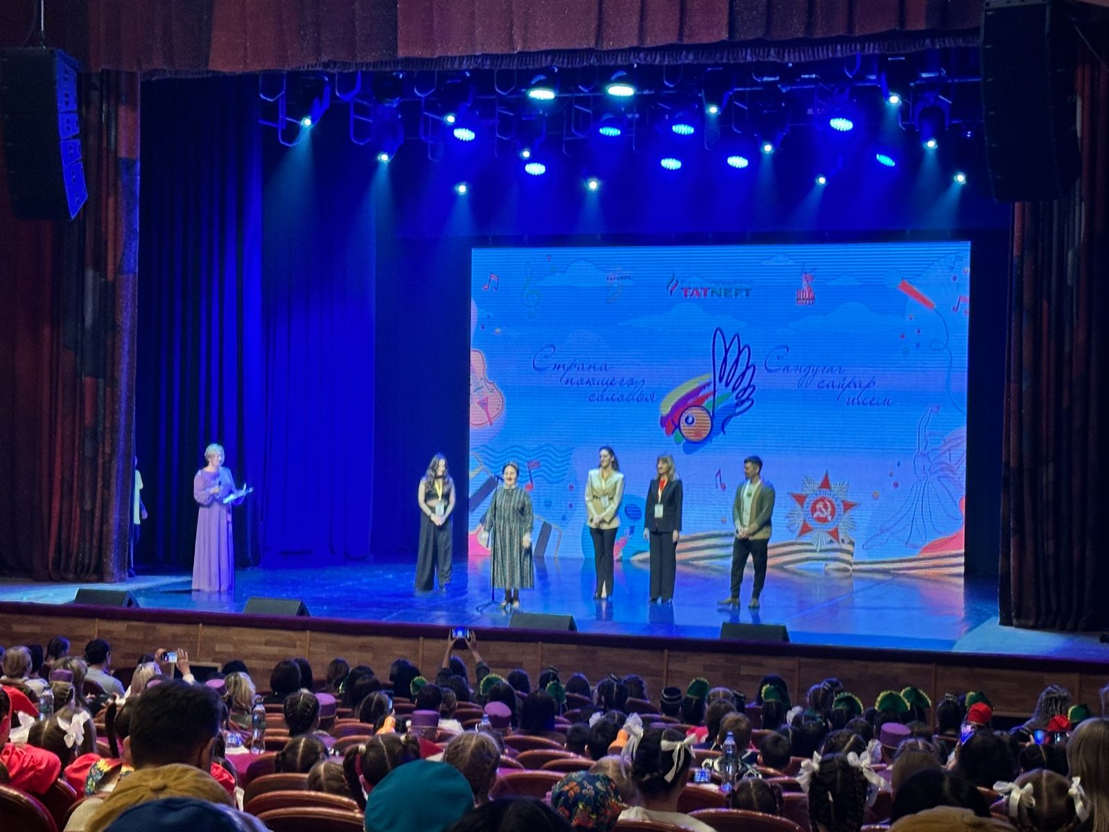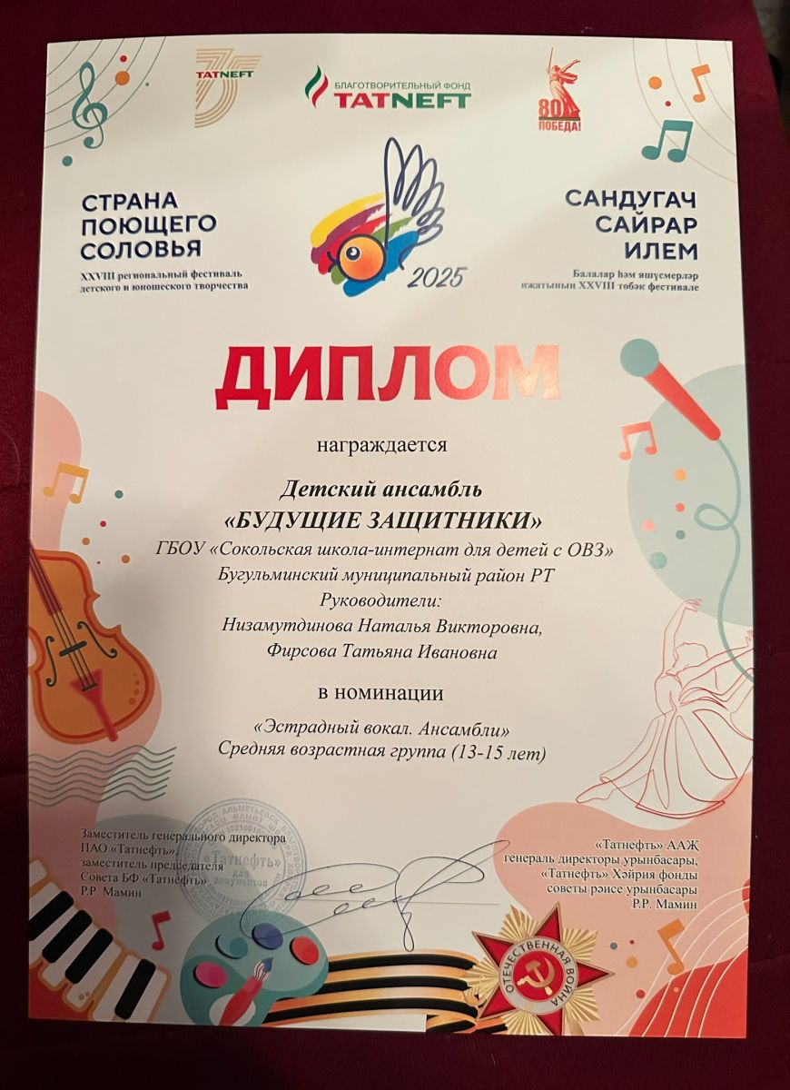 Советник директора по воспитанию Низамутдинова Н.В. совместно с ЗДВР Фирсовой Т.И., воспитателем Старчеусовой Н.Н. и детским ансамблем "Будущие защитники" нашей школы - интерната представили песню "Дай ему сил" в номинации "Эстрадный вокал. Ансамбли" на фестивале "Страна поющего соловья", в ДК "Нефтьче", г. Альметьевск, где стартовал XXVIII сезон регионального фестиваля детского и юношеского творчества. Юные таланты собрались на главной творческой площадке региона, чтобы продемонстрировать свои способности. Фестиваль организован БФ «Татнефть» и посвящен двум значимым датам — 80-летию Победы в Великой Отечественной войне и 75-летию Компании. Конкурс включает пять основных направлений: вокальное искусство, инструментальное исполнение, хореографию, художественное творчество и ансамблевые выступления. Выступления участников оценивалось профессиональным жюри из признанных мастеров искусства Татарстана и России. Наш вокальный коллектив стал дипломантом на детском фестивале!
