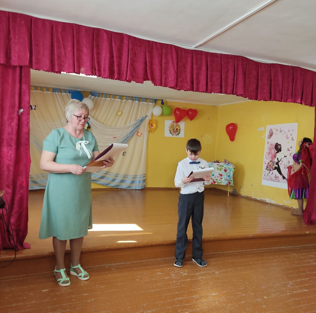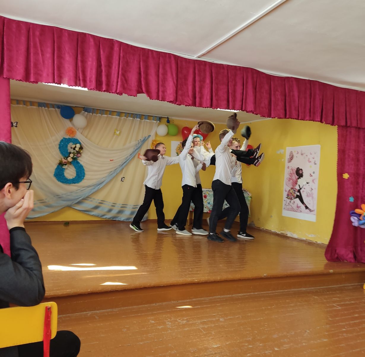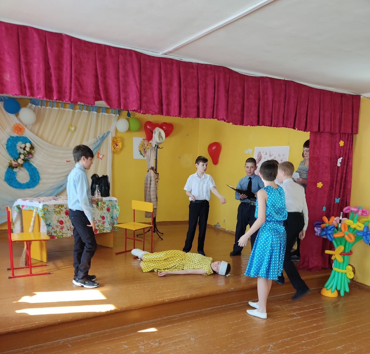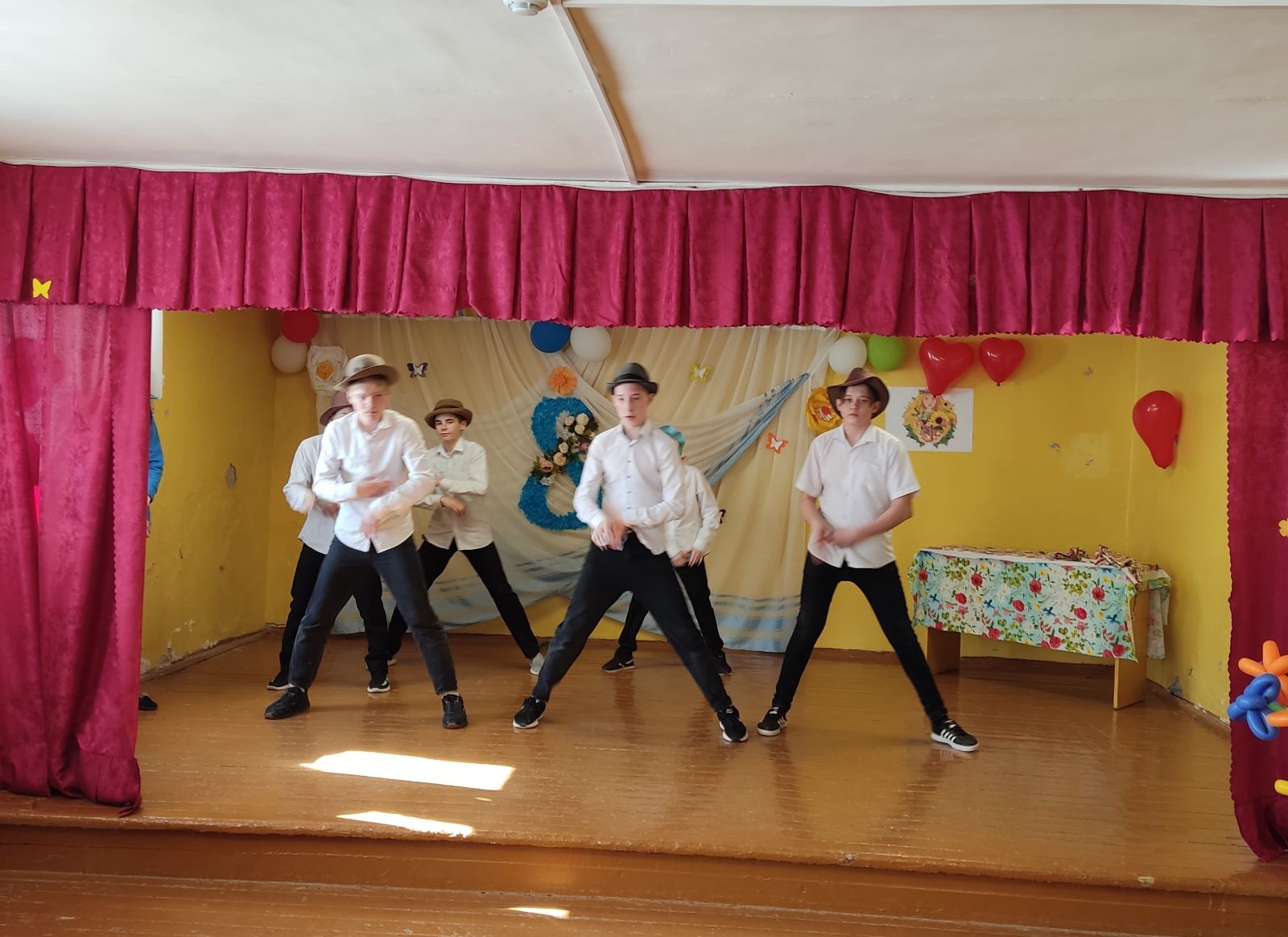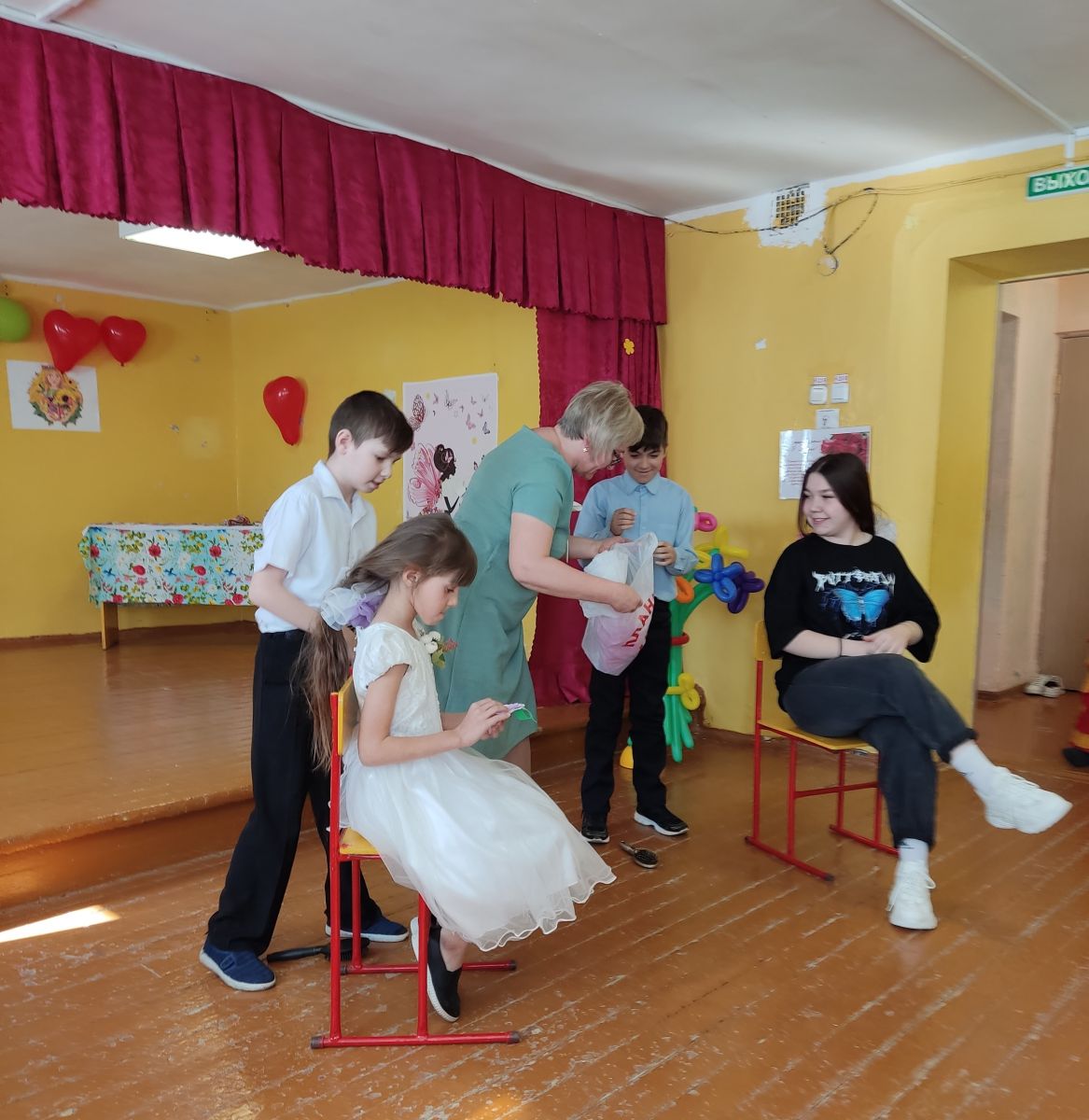 Проводили конкурсы, поздравляли всех с праздником, подготовили разнообразные номера художественной самодеятельности. Танцы сменялись стихами, песни — конкурсами. Поздравления, песни, танцы, стихи звучали для учителей и учеников.